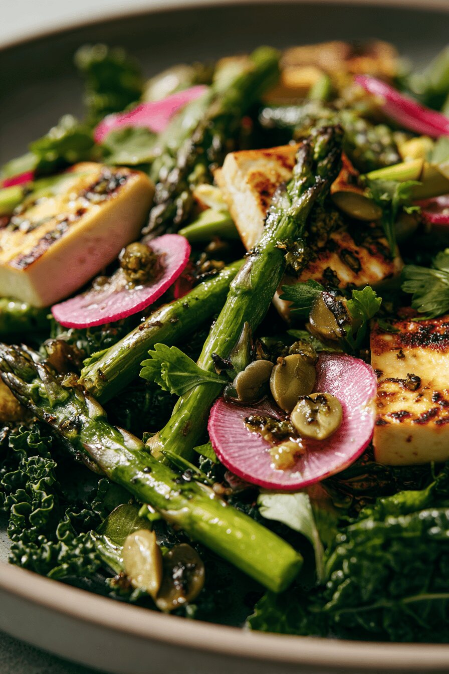 Mistura de texturas. Os aspargos ganham sabor diferente grelhando direto na churrasqueira, ficam crocantes porém macios. A cebola e o rabanete, caramelizados no wok no fogo, intensificam o adocicado do vegetal fresco. O tofu, normalmente neutro, aqui aparece em textura cremosa, quebrando o peso da grelha. O vinagrete leva um toque de balsâmico com melaço, mudando a acidez convencional. Sementes de girassol no lugar das tradicionais de abóbora, criam crocância e aroma diferente. Agrião substitui a tradicional alface para frescor com amargor leve. Sal rosa do Himalaia traz um leve toque terroso. Sem glúten, sem lactose, vegano. Cozinha prática, sem frescura.