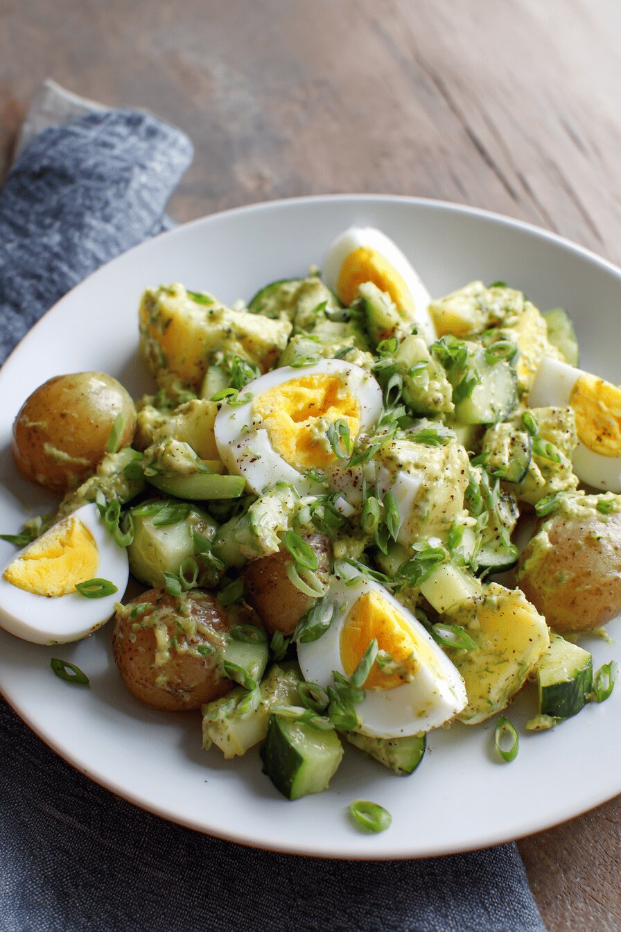 Salada simples feita com batatas grelots cozidas até ficarem macias mas firmes, ovos duros levemente amassados, e um molho de azeite, vinagre de maçã e mostarda Dijon. Acrescenta cebola roxa no lugar da cebolinha para um sabor mais marcante, além de salsão ralado em vez do tradicional céleri em pedaços. A mistura traz textura interessante, cores vibrantes e um toque ácido equilibrado. Pode ser servida morna ou fria. Prática, nutritiva, e ideal para quem busca algo leve, sem glúten nem lactose. Leve ajustes na quantidade de azeite conforme o ponto da mistura, e escolha batatas firmes para evitar que se desmanchem.