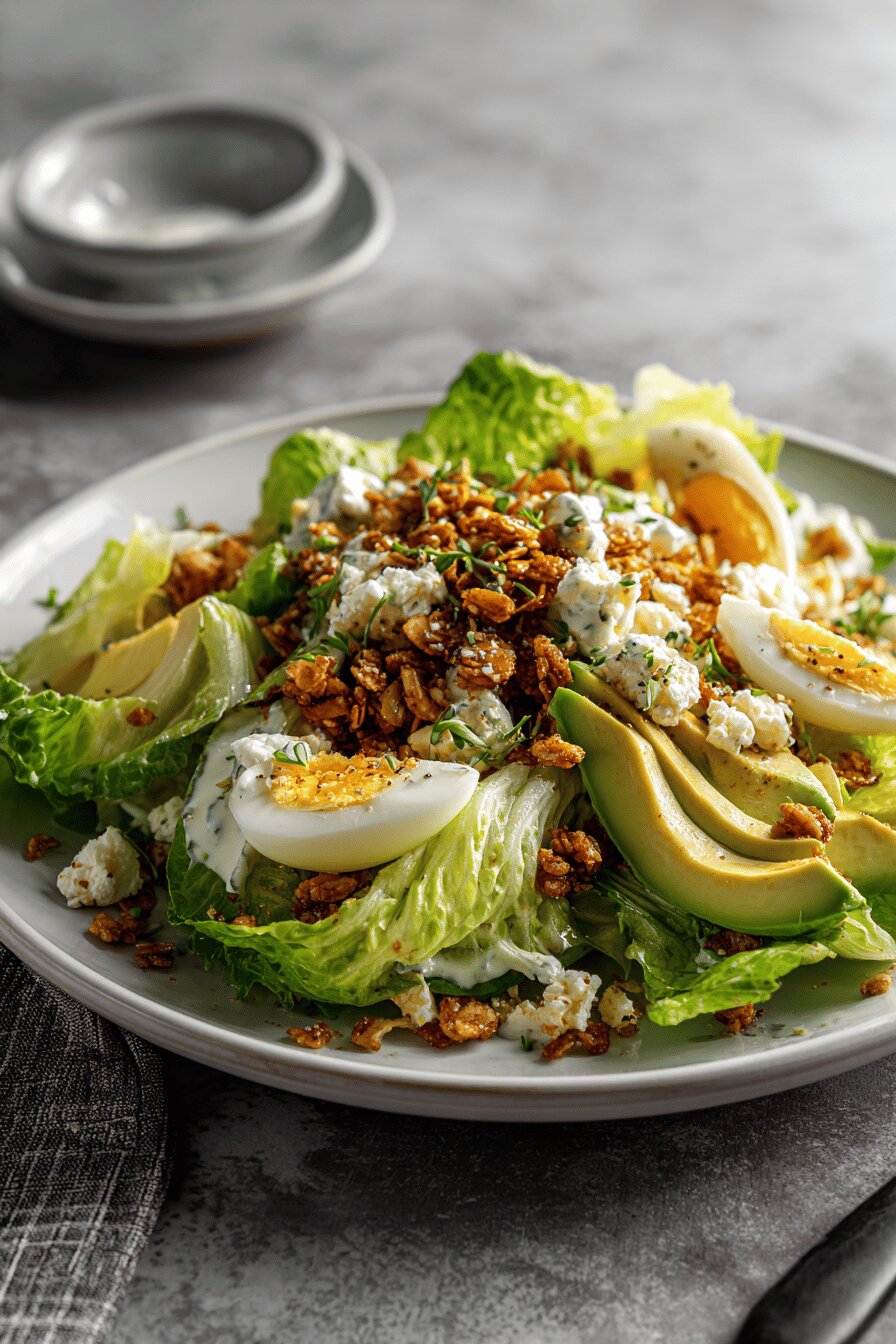 Salada fresca com granola salgada crocante, uma vinaigrette cremosa de inspiração italiana, folhas verdes e um toque de queijo feta. Fácil de montar, boa pra qualquer hora do dia, especialmente no brunch. Combina texturas e sabores com avogado macio, ovos cozidos e ervas frescas. Granola feita com sementes tostadas, adoçada levemente de forma equilibrada. Vinaigrette rica, cremosa, com iogurte e ervas, que traz leveza e sabor marcante. Prato vegetariano, sem glúten e livre de nozes, uma refrescância pra quem quer algo diferente e prático.