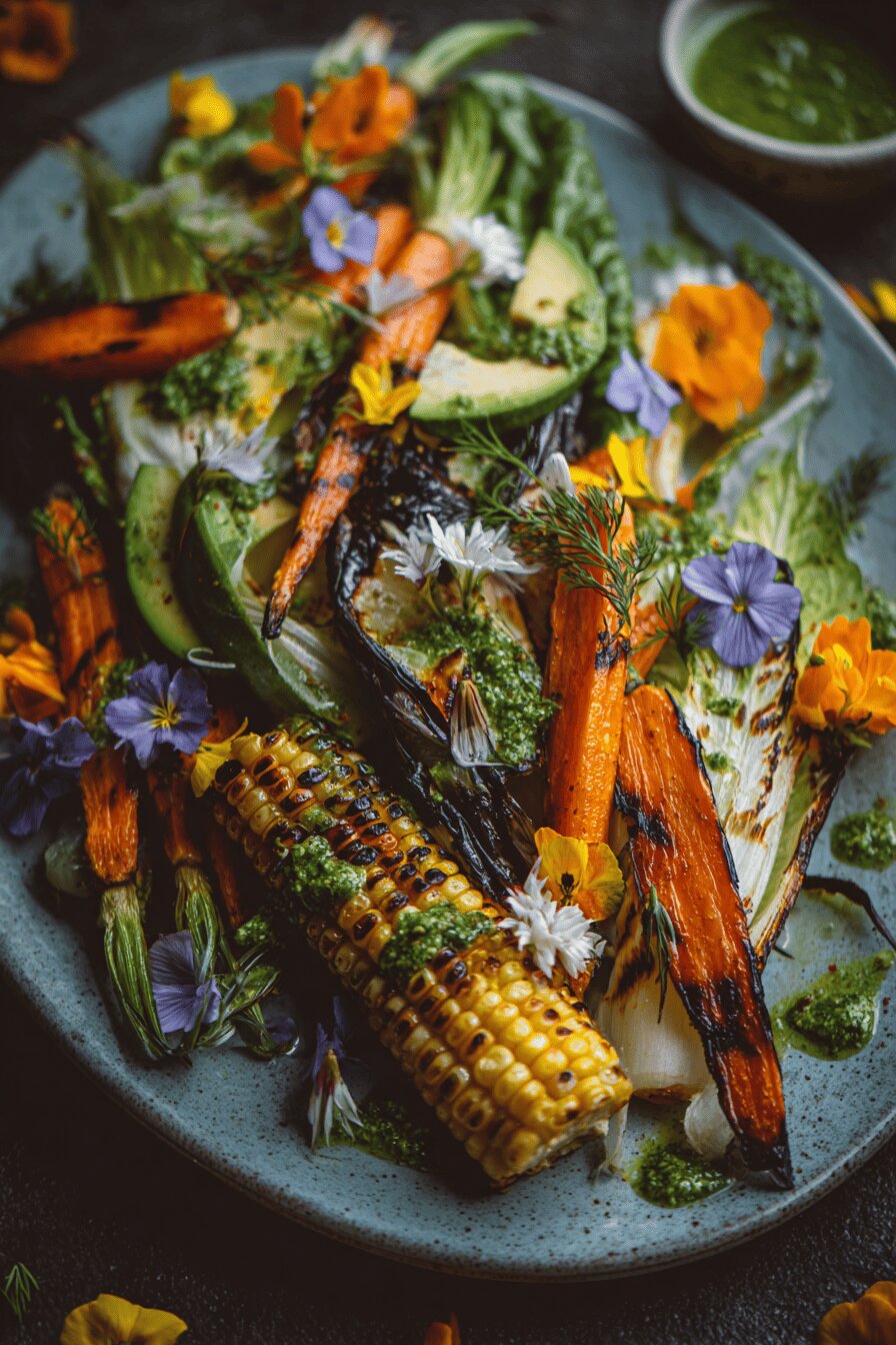 Grelhado, rápido. Tem milho — com canjica mas na espiga — e cenoura com aquela crocância que o brasa realça. Mistura verduras frescas pro crocante natural, alface pra forma. O molho é uma alteração do clássico chimichurri, menos vinagre e acrescenta cebolinha que para o cheiro faz dança. Melado substitui o mel pra toque bem brasileiro, leve e com sabor do cerrado. O rabanete, diferentão, substitui o tomate seco porque aqui a textura fica mais crocante e o gosto mais marcante. Tudo isso tá prontinho em 24 minutos. Serve quatro. Sem complicação, fácil para dias em que o calor quer comida leve, nutritiva, com alma e coragem. Pra quem exige sabor e simplicidade sem apelar no que compra. O abacate é o zilhão do prato; dá frescor e umidade que o cansaço do fogo seca. Só colocar limão pra não escurecer. Flores comestíveis? Se quiser fazer bonito, vai nelas, mas não é regra, não.