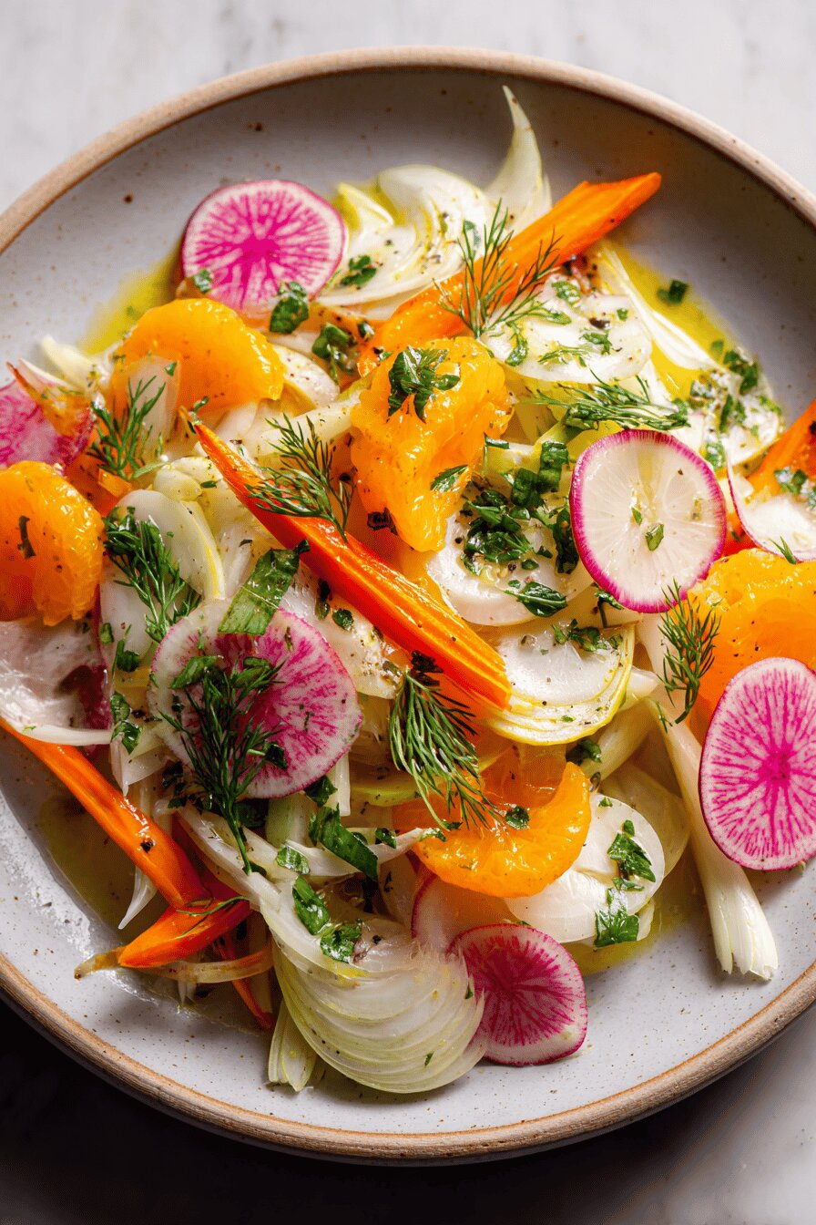 Salada feita com fatias finas de bulbo de funcho, cenoura e rabanete repousados em vinagre branco com toque de limão siciliano, intercalados com laranjas fatiadas. Excelente para quem gosta de contraste entre o cítrico e a crocância, sem glúten, lactose ou ovos. Cada etapa respeita textura e frescor, com ajustes de tempo no molho para garantir leveza. O funcho traz aroma de anis, a cenoura e o rabanete dão crocante, enquanto o molho com vinagre e azeite une sabores com delicadeza.