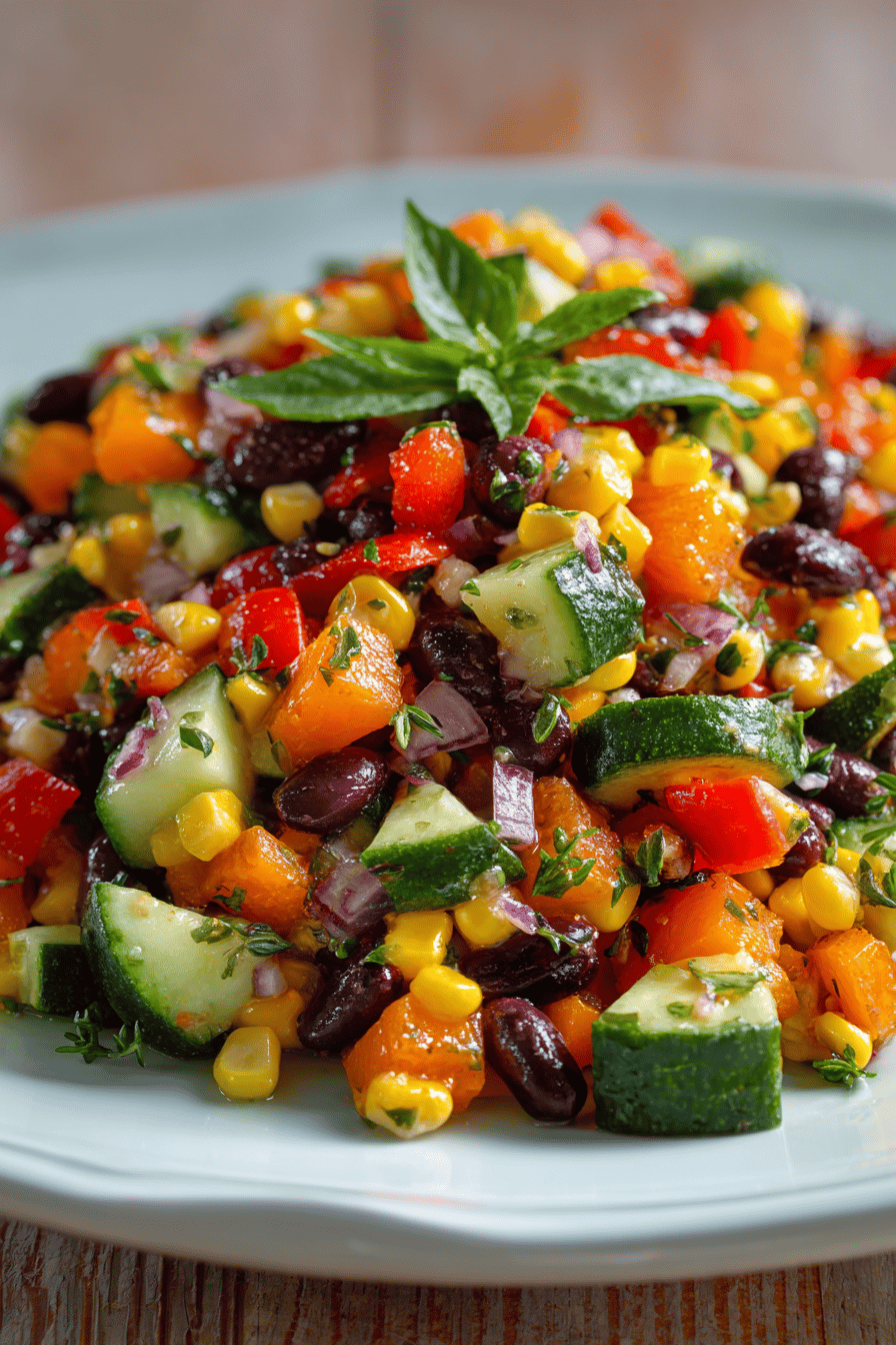 Salada refrescante e vibrante que combina milho cozido com feijão branco no lugar do preto para um toque diferente. Pimentão amarelo substitui o vermelho, trazendo doçura e crocância. Pepino comum usado para textura fresca. Molho de azeite com vinagre de maçã, adoçado com mel. Ervas frescas como coentro e tomilho ajustam o aroma e o sabor. Uma receita vegana, sem glúten e adequada para intolerantes a lactose e ovos. Ideal para servir como entrada ou acompanhamento em dias quentes. Fácil de montar, respeitando o tempo de repouso para que os sabores se misturem. Texturas variadas e visual alegre, quase festa dentro do prato.