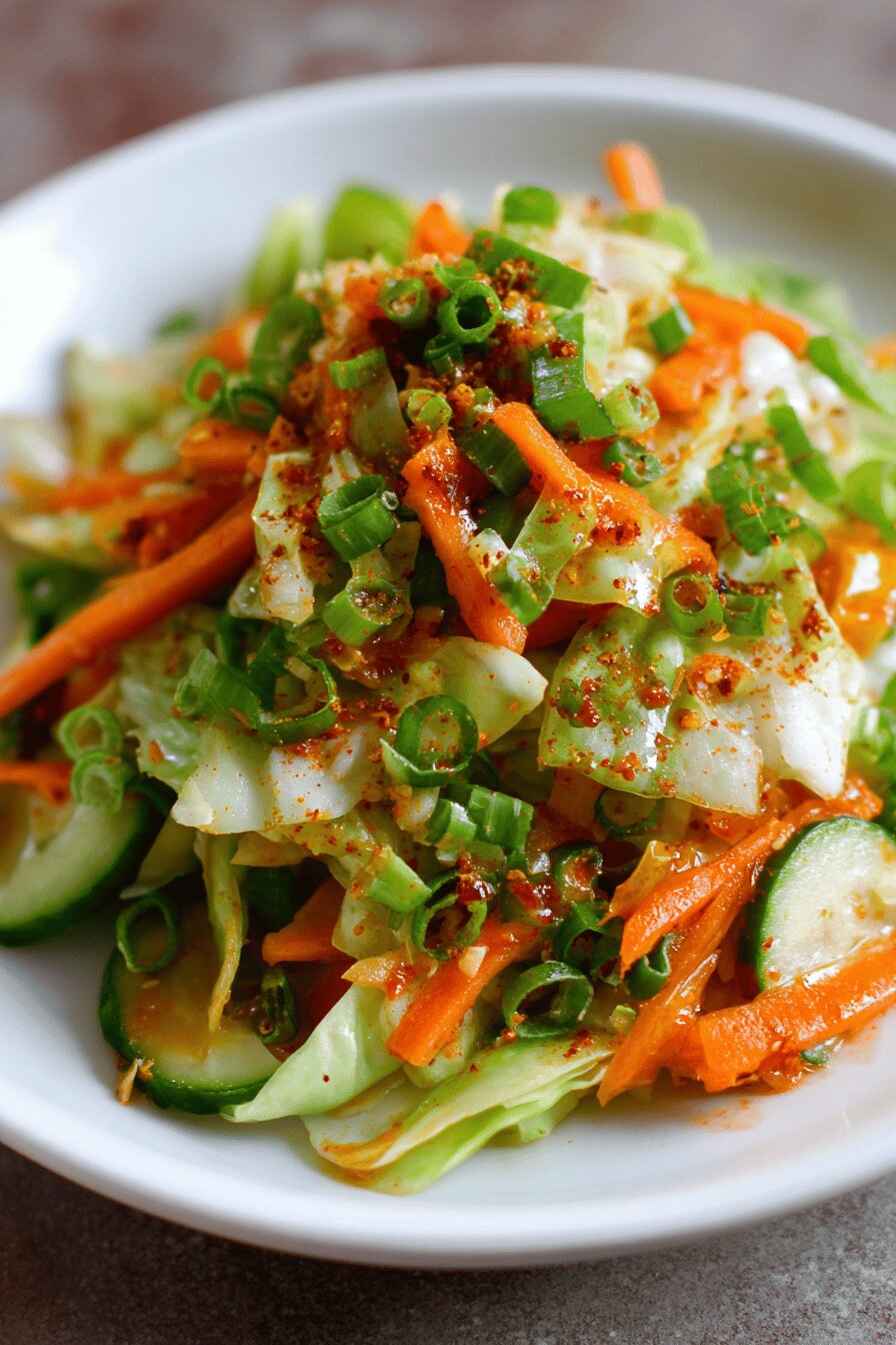 Misturar os vegetais secos com sal é o passo fundamental. O sal atua para retirar água e amaciar, mas cuidado para não exagerar, 20 ml para 700 ml de repolho é o ponto certo. Deixar cerca de 55 minutos suficiente pra soltar líquido, não mais que isso. Depois lavar rapidamente para tirar o excesso do sal e secar bastante evita que a salmoura fique forte demais. Usar pano seco ou conseguir muito papel absorvente pra retirar toda água. Misturar então com pepino, mel e vinagre, mexendo devagar para não machucar o pepino nem perder crocância. Pimenta calabresa na medida certa porque ela tem sabor forte, defumada traz um toque especial. Deixar no frio, geladeira, para macerar mais 50 minutos, pode deixar até a noite inteira para sabores mais fortes, cozinheiros recomendam ajustar o tempo de acordo com gosto pessoal. Bom acompanhamento para pratos gordurosos, carnes ou só para petiscar..