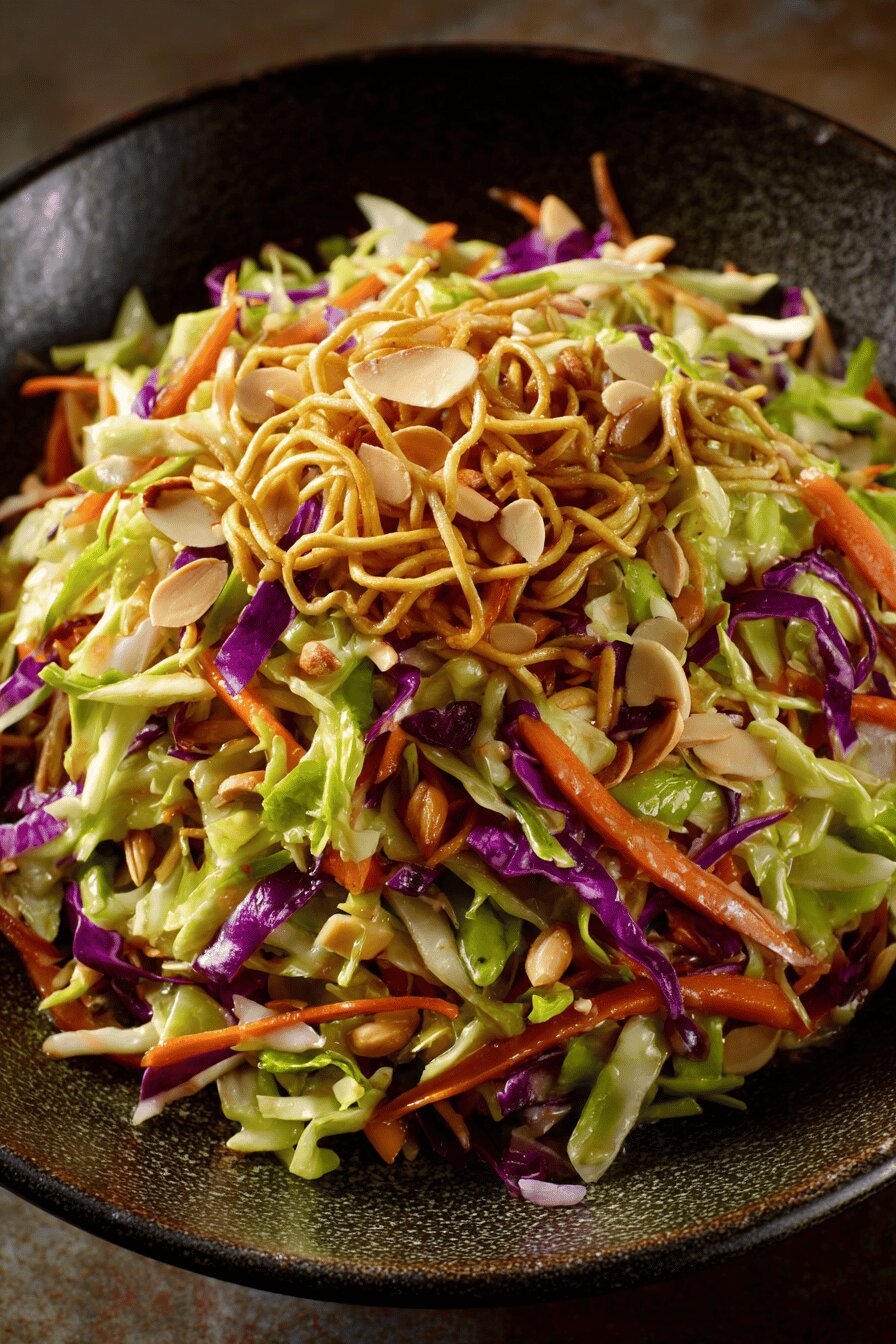 Combina repolho verde e roxo finamente cortados, cenouras em julienne, no estilo asiático. Molho agridoce com vinagre de maçã e mel, troca o arroz pelo vinagre de maçã, mistura óleo de amendoim e óleo de gergelim. Nitro adicionado com castanha de caju no lugar de amêndoas, trazendo outra textura e sabor. Finaliza com macarrão frito crocante, aroma de gergelim tostado e pimenta do reino para equilibrar o doce e o picante. Pronto rapidinho, refrescante, dá pra servir com frango, porco ou camarão. Uma salada que sempre surpreende, textura e contraste únicos.