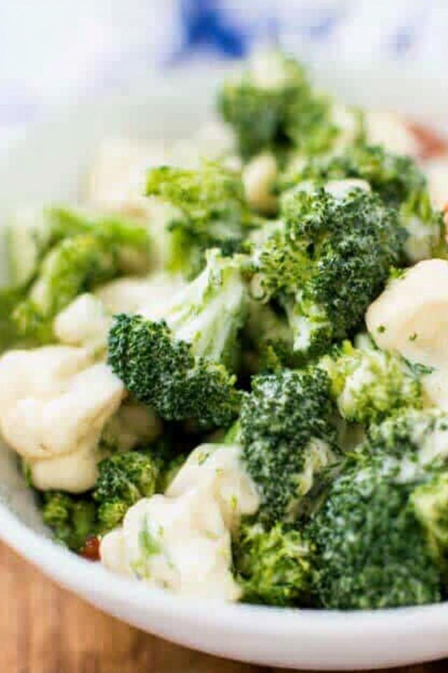 Brócolis e couve-flor picados em tamanhos pequenos, envoltos em um molho generoso à base de maionese, iogurte e um toque de limão. Cebolinhas frescas dão um sabor extra. Precisa descansar na geladeira para os sabores se juntarem. Fácil e leve, com variações simples que salvam quando falta algum ingrediente. Serve seis, pouca gordura e bastante vitamina C. Ótima para acompanhar churrasco ou almoço rápido.