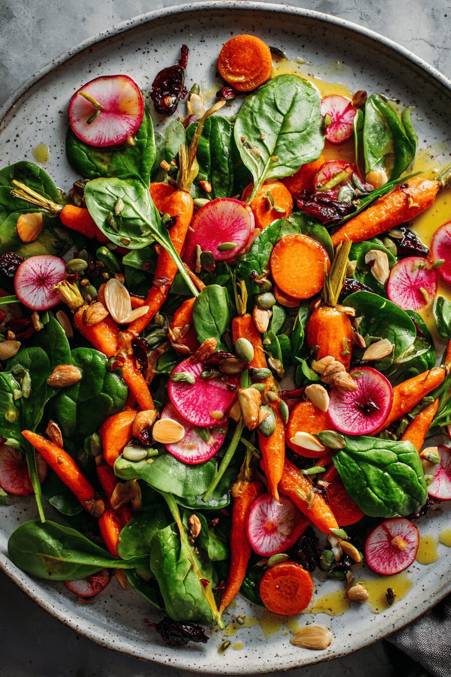 Salada vibrante e crocante com legumes frescos usando cenouras coloridas e rabanetes, folhas de couve kale substituídas por rúcula jovem para um toque levemente picante. Cremoso do molho vem do azeite com limão e mel em lugar do xarope de bordo. Crocância extra das nozes pecãs ao invés das sementes de girassol. Tudo combinado num movimento simples e eficaz, um arremate refrescante para dias corridos.