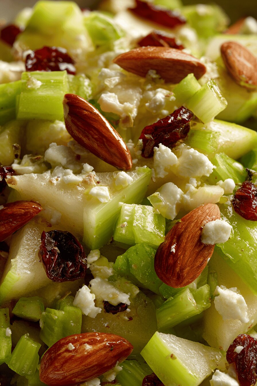 Ricota no lugar da feta. Troca o aipo que é mais rústico, pelo pepino. Mais crocante, suave. A maçã verde entra com acidez, substitui a pera asiática que não se acha fácil por aqui. Damasco seco dá aquele docinho natural muito brasileiro, combina com o crocante da noz em vez da pistache que é mais cara e difícil de achar. Limão vira imprescindível, realça tudo junto com o vinagre de maçã, usado no lugar do vinagre branco para um sabor mais adocicado e menos agressivo. Pimenta dedo-de-moça traz picância que vai na medida, diferente do pimentão ou pimenta de outro tipo. Tudo fresco, rápido, sem fogão. Misturar na tigela e montar em prato raso. Pronto em 25 minutos, uma entradinha leve que agrada em dias quentes, festas ou só para beliscar.