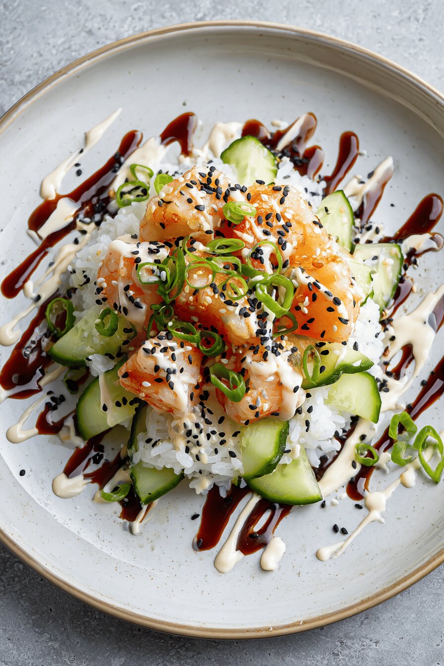 Lavar o arroz até a água ficar quase cristalina é o segredo pra textura solta. Cozinhando com tampa firme evita vapor perder. Misturar vinagre, açúcar e sal antes do arroz ficar frio faz a cobiçada camada brilhante e saborosa. Na salada, cortar legumes pequenos e distribuir uniformemente ajuda a ter explosão de sabores em cada garfada. Não mexer demais os camarões para evitar ficar pastoso. Apertar levemente o arroz no aro para manter a forma, mas não muito para não ficar grudento. Servir logo após montagem porque a maionese pode soltar líquido e amolecer o arroz. Experimente substituir o shoyu por molho ponzu para outra camada de sabor. Com essas observações, evita erros que derrubaram versões anteriores.