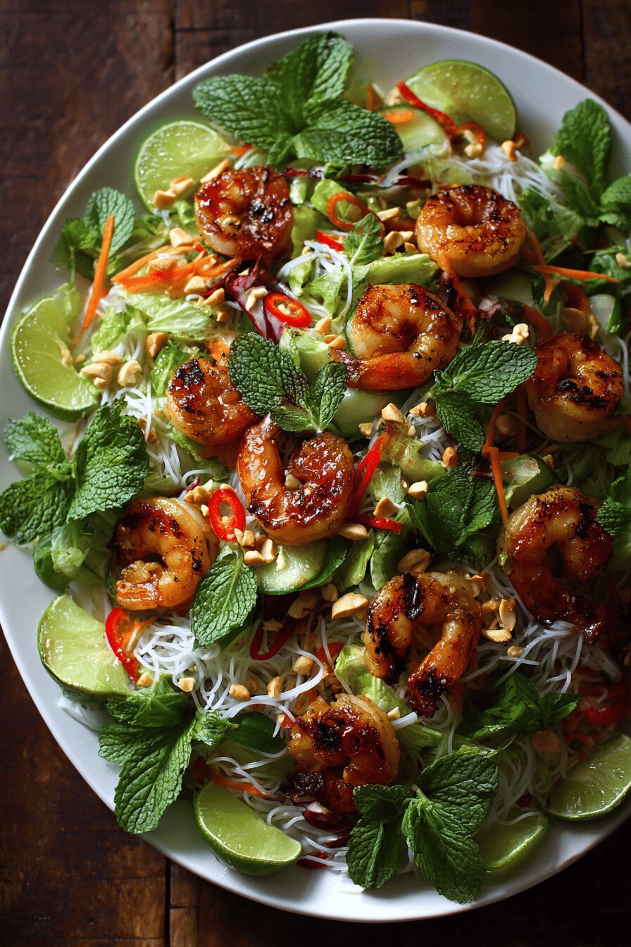 Salada fresca com camarões dourados, vermicelli de arroz, pepino e hortelã, temperada com molho agridoce picante e toque de limão. Leve, crocante, aroma marcante de gengibre e óleo de gergelim tostado. Perfeita pra dias quentes, sem lactose, ovos ou nozes, flexível pra substituir ingredientes conforme despensa. Técnica simples, mas que exige atenção no ponto dos camarões e textura dos noodles. Serve 4 pessoas.