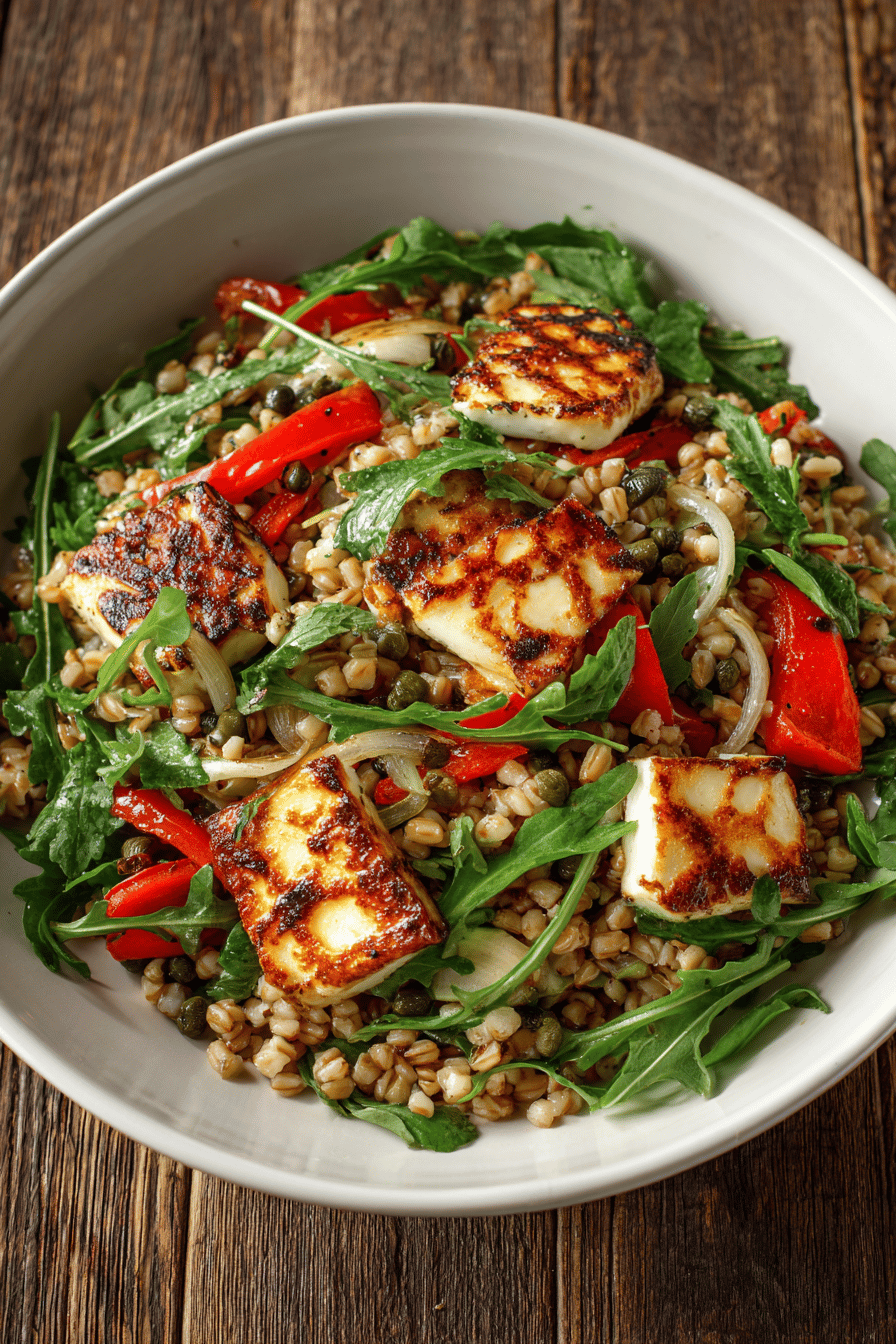 Salada fresca, colorida e robusta. Cevada perolada cozida no ponto certo, misturada com pimentões assados que soltam aquele aroma adocicado e levemente defumado, combinados com queijo branco esfarelado. Tomates-cereja frescos, rúcula picada e azeitonas verdes cortadas fazem contraste. Um toque cítrico do limão realça tudo, enquanto folhas de manjericão fresco por cima dão frescor. Leve, porém com corpo e textura. Ideal para almoço rápido ou jantar leve, aguenta bem na geladeira até três dias, ótima para deixar pronta no dia anterior. Versátil e fácil de adaptar ao que tem na despensa.