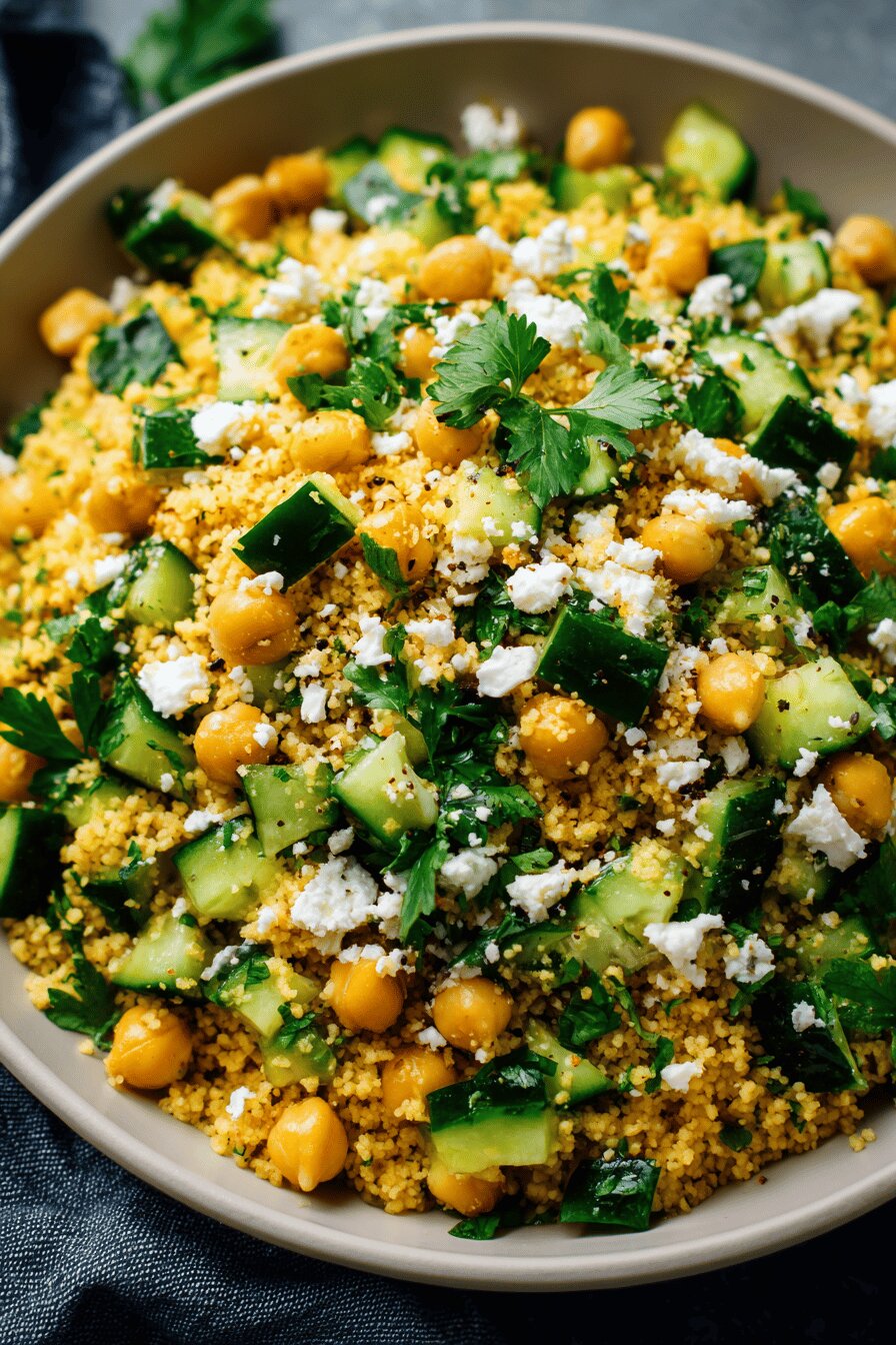 Uma salada leve com couscous, vegetais frescos e leguminosas, temperada com especiarias aromáticas e ervas frescas. Combinação de texturas entre o macio do couscous, a crocância do pepino e pimentão, finalizando com o toque salgado do queijo coalho. Versátil, serve como entrada ou acompanhamento em almoços rápidos. A troca de caldo e ingredientes confere um sabor adaptável conforme o que se tem na dispensa. Rápido e prático, com tempo total por volta de 45 minutos para hidratar e deixar os sabores se encontrarem.