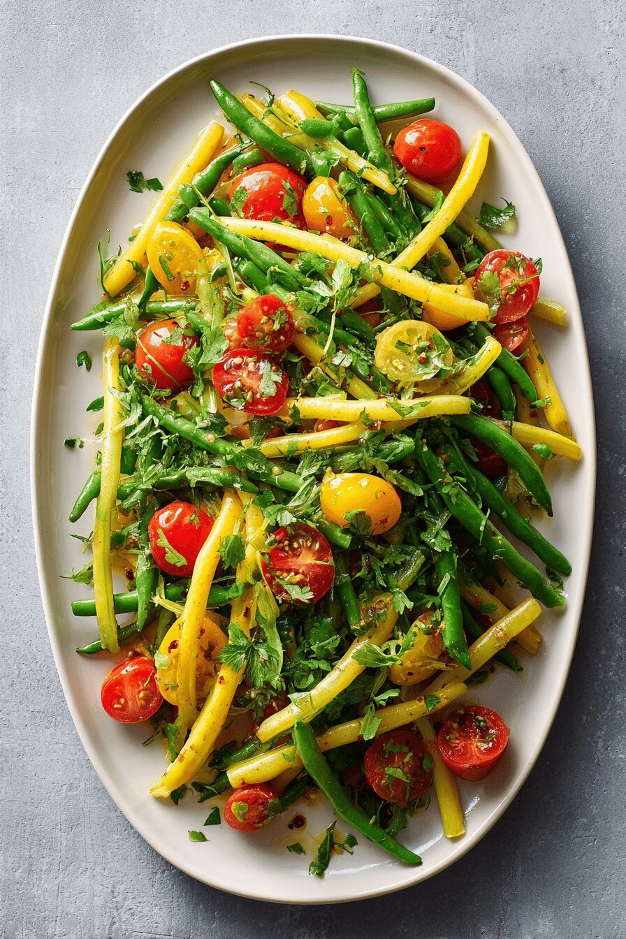 Uma mistura fresca de feijão amarelo verdejante, rúcula picante e tomates cereja vibrantes. A vinaigrette traz um toque cítrico com limão e a doçura sutil do melado de cana no lugar do sirope de bordo. Rápido, leve e sem ingredientes de origem animal ou glúten, ideal para dias quentes. No preparo, atenção ao ponto do feijão: deve ficar firme, mas macio para não desmanchar. A combinação de texturas aqui é essencial, com o frescor da rúcula complementando a crocância dos feijões e a suculência dos tomates. Pelo aroma do azeite e vinagre, pelo contraste visual dos legumes e pelo sabor equilibrado, é uma receita para guardar.