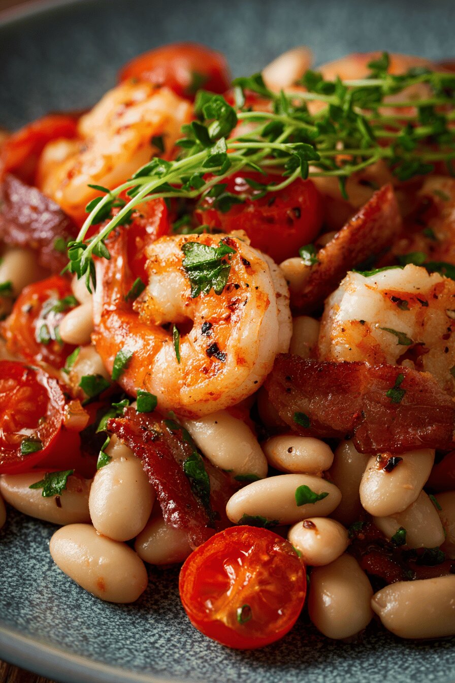 Feijão branco, camarão, bacon crocante. Não tem mistério. Rapidinho fica pronto. Frio ou quente, cabe bem no almoço ou janta. Valor proteico bom, fibra e sabor que curte todo mundo. Páprica mistura com toque de limão. Pimenta dedo-de-moça corta a doçura do tomate e do feijão. Um prato que traz o frescor da erva brasileira junto com a pegada mediterrânea do azeite e do vinagre. Equilibrado. Leve para dias quentes ou pra quem quer comer algo mais natural. Fácil de fazer, pouco ingrediente, gasto moderado. Serve a família ou convidados. Presença garantida em almoços práticos, parrillas ou bate papo com cerveja gelada. Achou complicado? Nem tanto, aqui o segredo é só pegar o jeito de grelhar o camarão e deixar bacon crocante. O resto é combinar, ajustar sal e pronto.