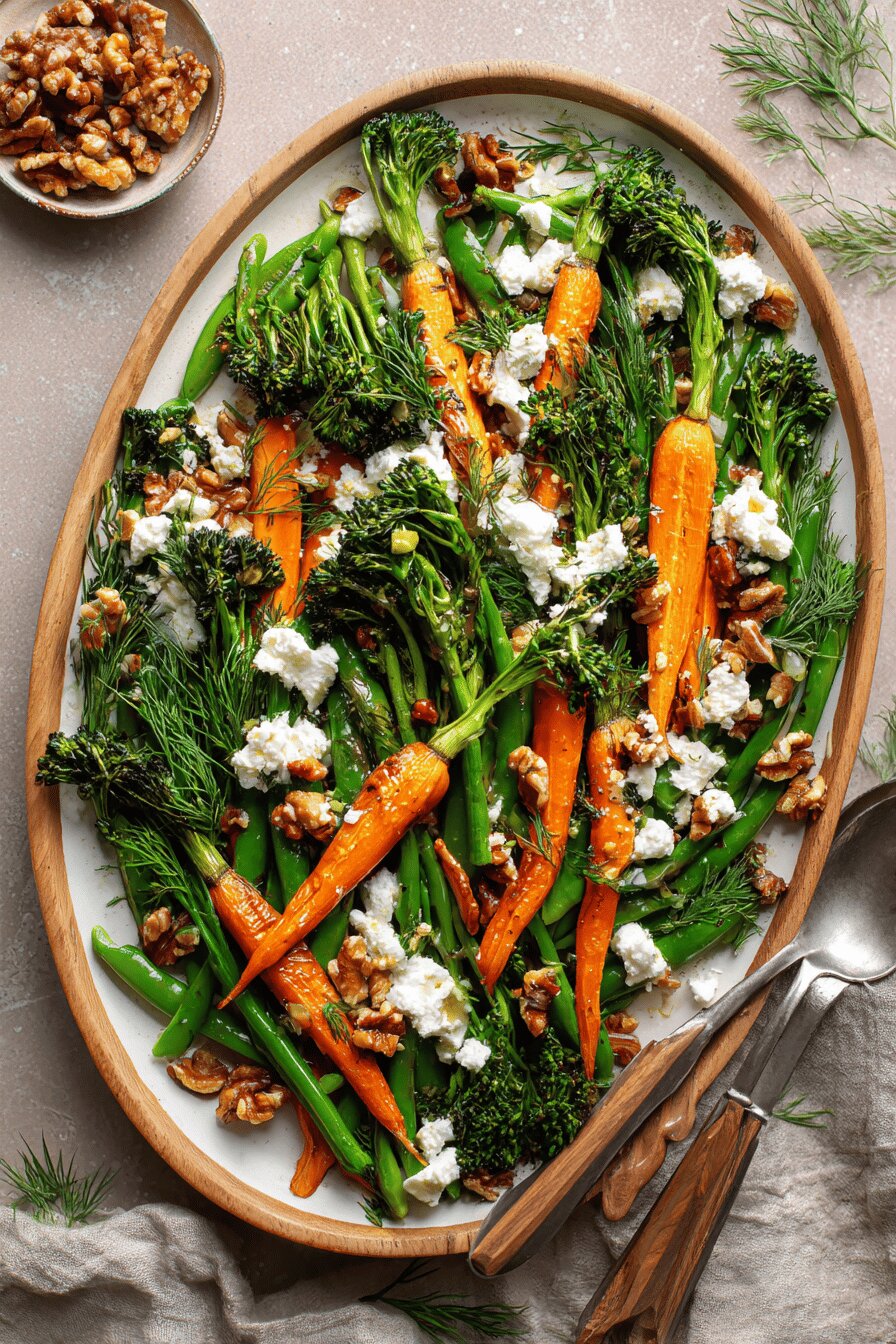 Salada-refeição vegetariana, sem glúten e sem ovos, que combina legumes assados crocantes com queijo ricota e castanhas, trazendo textura e sabor. Usa legumes frescos variados como aspargos, couve-de-bruxelas e vagem, temperados com azeite, vinagre de maçã, orégano seco. Os tempos de forno ajustados para garantir crocância sem amolecer demais. Atalho prático com ricota substituindo queijo cottage e nozes pecan no lugar das nozes comuns. Pode ser servida quente ou em temperatura ambiente, perfeita para refeições rápidas cheias de cor e nutrientes.