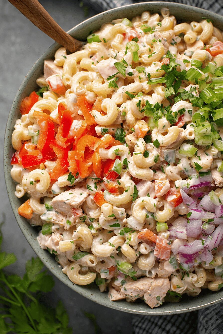 Uma salada fria que reúne macarrão cotovelo cozido no ponto, pedaços de frango desfiado, legumes crocantes e um molho cremoso com maionese e iogurte. Ajustada para quem gosta de um toque a mais de sabor com mostarda Dijon e um toque de suco de limão para equilíbrio. A mistura fica fresca, colorida, perfeita para dias quentes, com textura que vai do macio ao crocante, sem exagero nos temperos. Serve cerca de seis pessoas, uma opção prática pra almoço ou lanche da tarde.