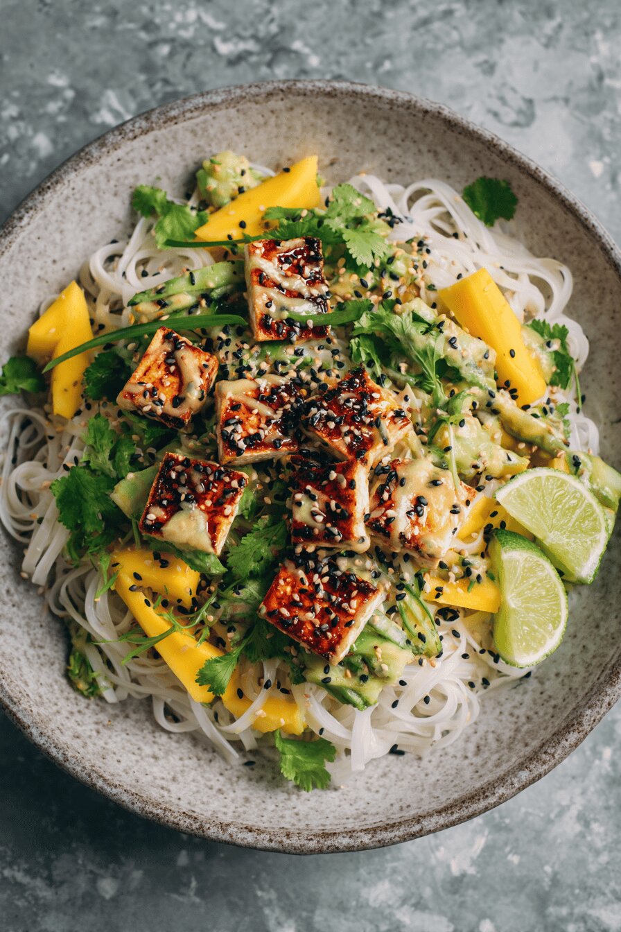 Macarrão de arroz macio envolvido em molho de tahine com toque cítrico e picante; tofu marinado e dourado; manga e abacate fresquinhos para contraste. Combinação de texturas e aromas tropicais numa receita fácil, leve, plant-based, sem derivados animais ou glúten. Prato rápido, com macarrão na medida certa, molho cremoso e notas marcantes de alho, limão e pimenta. Tem toque asiático-sudeste que traz frescor e exotismo. Atualizado com limão siciliano no lugar do tradicional, para dar acidez mais complexa, e adição de óleo de gergelim torrado para aroma maior. Vegetariana, nutritiva e cheia de personalidade — receita para quem gosta de sabor de verdade.