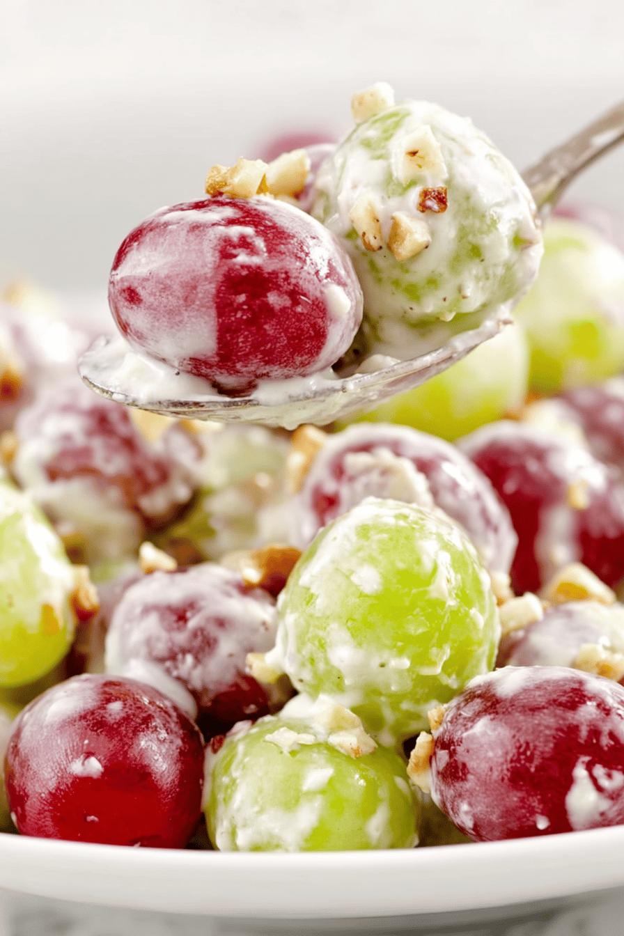 As uvas sem sementes são essenciais pra evitar o desconforto na hora de servir. Recomendo lavar e secar muito bem; água residual amolece o creme e pode deixar a mistura aguada. Para o creme, mantenha o cream cheese em temperatura ambiente, assim mistura com facilidade e evita grumos. O creme azedo pode ser substituído por iogurte grego mais denso se quiser versão mais leve, porém o sabor muda. Use extrato de baunilha de boa qualidade, porque o aroma é delicado mas fundamental. Açúcar pode ser reduzido se não gostar de doce excessivo ou use açúcar demerara para variação. Nozes pecan torradas realçam sabor, alternativas como castanha de caju ou amêndoas ficam ótimas também.