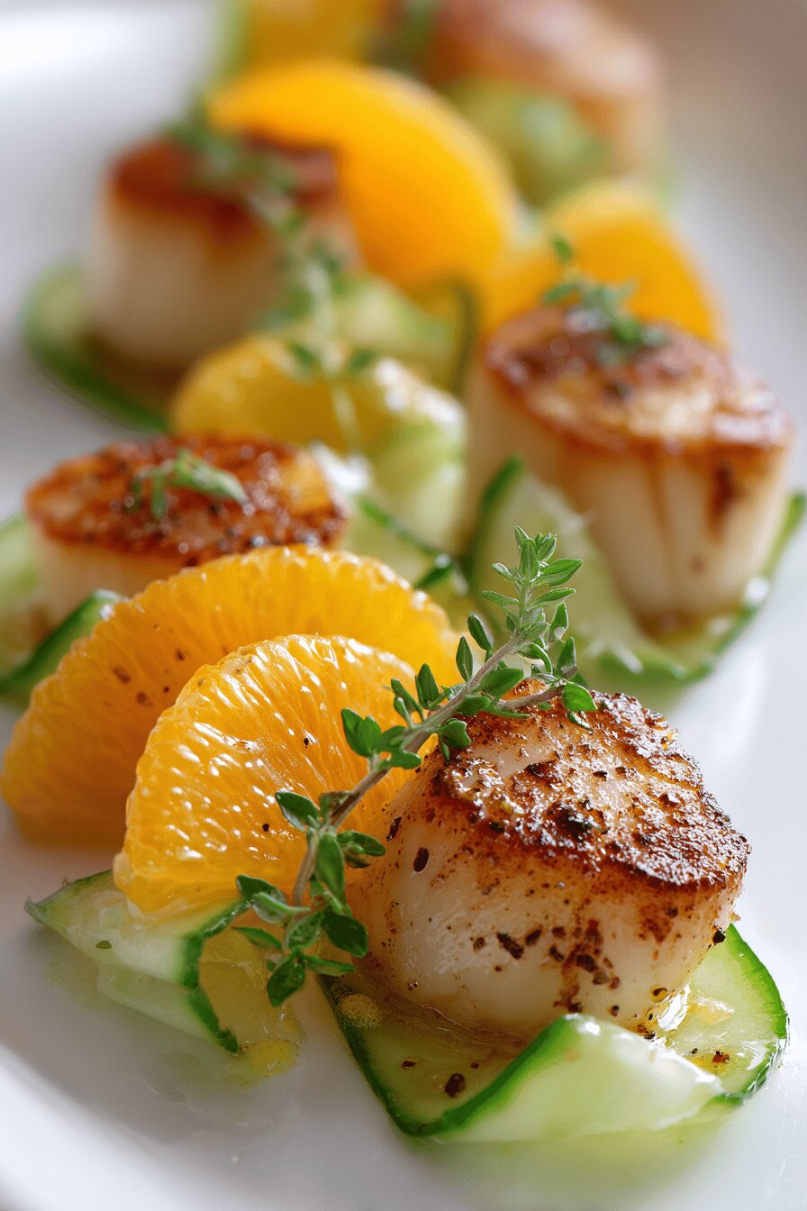 Uma salada leve com vieiras seladas na frigideira, fatias finas de pepino e gomos de laranja, envoltos numa vinagrete cítrica com toque de mostarda e mel. Servida em tulipas de alface crocante, perfeita para entrada refrescante livre de glúten, lactose, ovos e oleaginosas.