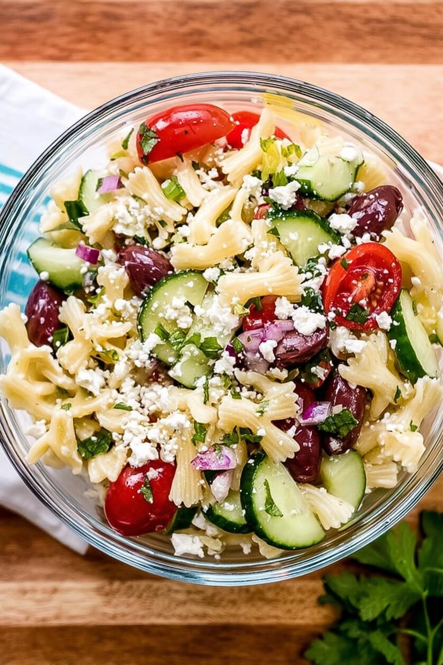 Salada de massa com toque grego, usando ingredientes frescos e um molho cítrico. Massa cozida al dente, legumes crocantes, azeitonas e queijo feta misturados num molho caseiro à base de azeite, suco de limão e orégano. Texturas e sabores marcantes que equilibram o prato. Troque o rigatoni por penne ou fusilli. Fique de olho na massa; não pode passar do ponto nem ficar crua. Use queijo tipo minas ou ricota fresca como alternativa. Fácil, versátil, refrescante e pode ficar pronta em menos de 25 minutos, ideal para almoços rápidos ou picnic no verão.