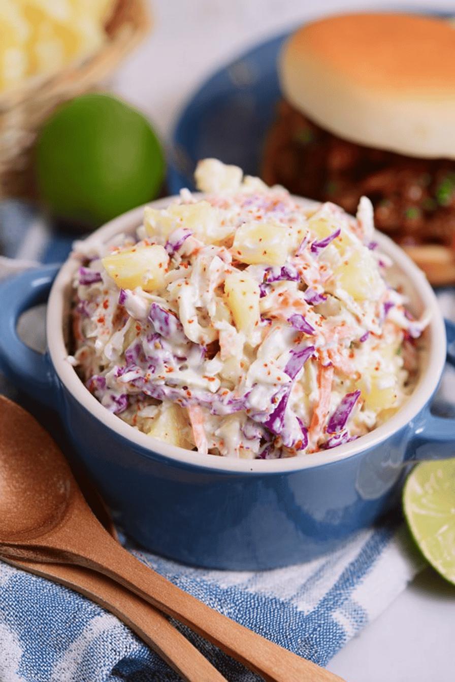 Salada fresca com abacaxi amassado, iogurte grego, limão, toque picante e mix de repolho pré-ralado. Versão adaptada para manter crocância e equilíbrio entre doce, ácido e picante, com tempero salgado essencial. Ideal para acompanhar churrasco ou pratos leves, fácil de preparar e prática para guardar na geladeira.