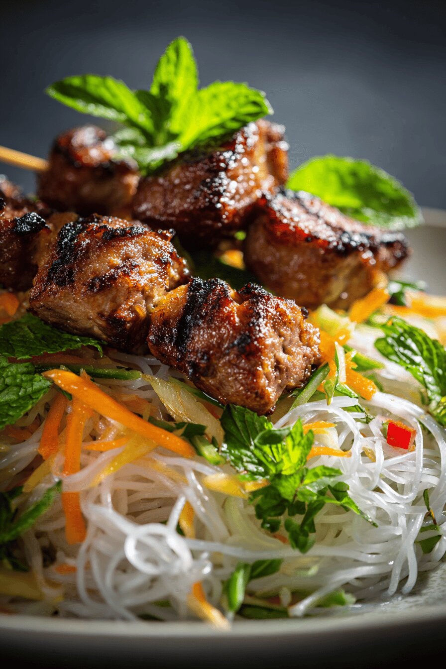 Salada com macarrão de arroz, legumes crocantes e brochetes de porco marinados na citronela, pimenta e alho amassado. Combina texturas e sabores intensos, com molho picante enriquecido com tamarindo e caldo de peixe. Macarrão cozido rapidamente, servido frio para contraste com espeto grelhado. A mistura de hortelã, coentro e legumes frescos traz frescor, equilibrando o ardor do tempero.