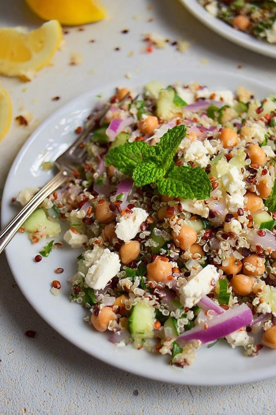 Salada feita com quinoa levemente cozida, grão-de-bico, pepino picado, cebola roxa, salsinha, hortelã, pistache e queijo coalho no lugar do feta. Temperada com azeite, suco e raspas de limão, sal e pimenta. Combinação de texturas crocantes com cremosidade do queijo. Bem colorida, leve e nutritiva, ótima para dias quentes ou como acompanhamento. Receita ajustada com tempos e técnica para garantir quinoa soltinha, usando toque de limão siciliano para aroma a mais e substituindo queijo pra variar sabores, mantendo equilíbrio e frescor.