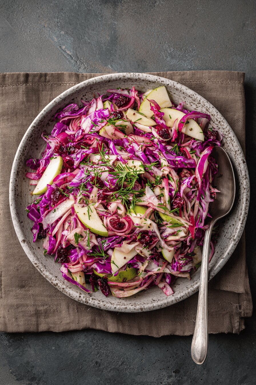 Salada vegana e crocante feita com repolho roxo fatiado finamente, maçã verde e cranberry, temperada com um vinagrete levemente adocicado de melado e vinagre de maçã. Texturas que contrastam e aromas frescos, perfeita para dias quentes, sem glúten, sem lactose e sem ovos. Ingredientes fáceis de encontrar, receita rápida que melhora com o tempo na geladeira, ideal para preparar antes e servir gelada.