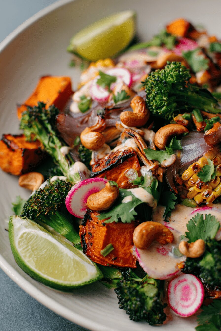 Mistura de batata-doce assada, brócolis crocante, milho e frango desfiado, tudo regado com uma marinada vietnamita e toque picante de maionese. Texturas variadas, sabores frescos e um gostinho cítrico final com limão.