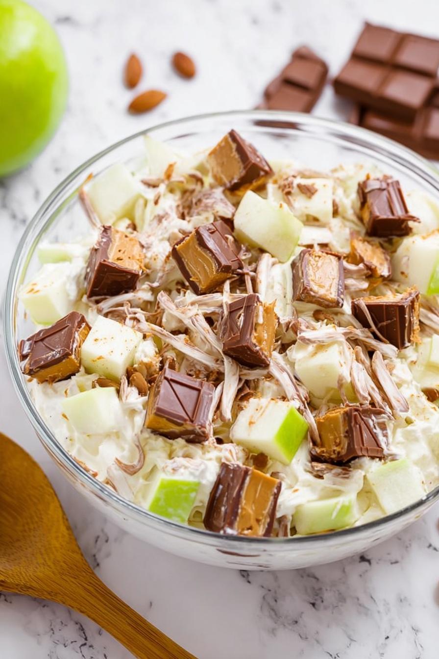 Mistura rápida de pudim de baunilha com pedaços de maçã, barra Snickers e um toque de maracujá para refrescar. Textura cremosa com crocância e um contraste ácido que corta a doçura intensa do chocolate. A maçã mantém o frescor da receita, enquanto o maracujá adiciona uma camada fresca e menos enjoativa. Ótimo para quando a vontade é por algo doce, mas com personalidade e ingredientes fáceis na despensa.