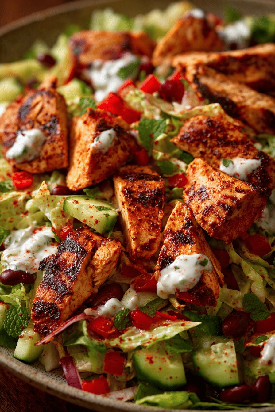 Comece preparando o molho para que os sabores tenham tempo de se fundir na geladeira. O processador vai fazer a mistura rápida e homogênea. Temperar o frango com chili em pó é fundamental para dar o toque quente – não precisa exagerar senão fica ardido demais. Grelhe com a grade bem quente para marcar bonito e dar sabor de churrasco. O descanso do frango na geladeira deixa o corte mais fácil, evita perder suco e mantém temperatura segura. Assemblar a salada é questão de distribuir cores e texturas para que cada garfada tenha equilíbrio: verde, vermelho, creme, preto e crocante. Salpicar sal e pimenta antes de servir é importante, pois o molho e o feijão não trazem tanto sabor salgado. Creme azedo na lateral para quem quiser um toque ácido e refrescante. Sirva imediatamente para garantir a crocância das folhas e dos chips, que se molhados perdem a graça.