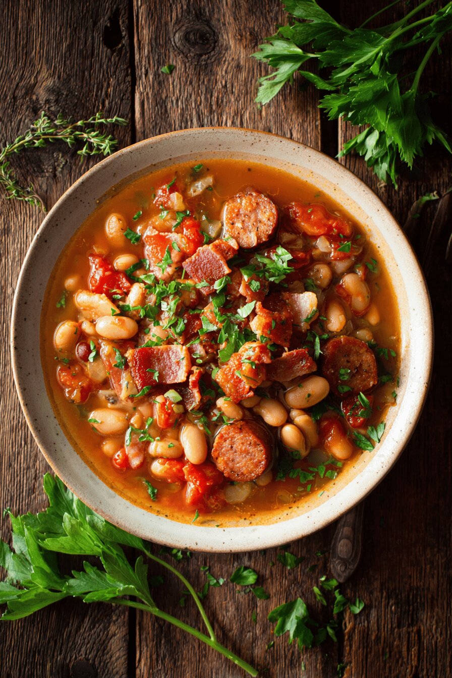 O feijão branco é a base, pode trocar por feijão manteiguinha caso não ache flageolet, ambos têm textura parecida e cozinham relativamente rápido. Se só tiver feijão carioca, o tempo muda; cuidado para não desfazer. Se não tiver pancetta bacana, bacon defumado da boa serve - só controlar a quantidade pra não ficar muito forte. Creme de leite fresco pode virar creme de leite comum, ajustar um pouco a consistência. Para o caldo, caldo de legumes substitui caldo de galinha se quiser versão vegetariana. Quanto às salsichas, a original francesa usa Toulouse, no Brasil preferi linguiça toscana, pegajosa na medida, mas o importante é frescor da carne. Assim o caldo fica rico e não aguado. A salsa é pra finalizar, só coloca na hora final pra manter cor e aroma vivos.