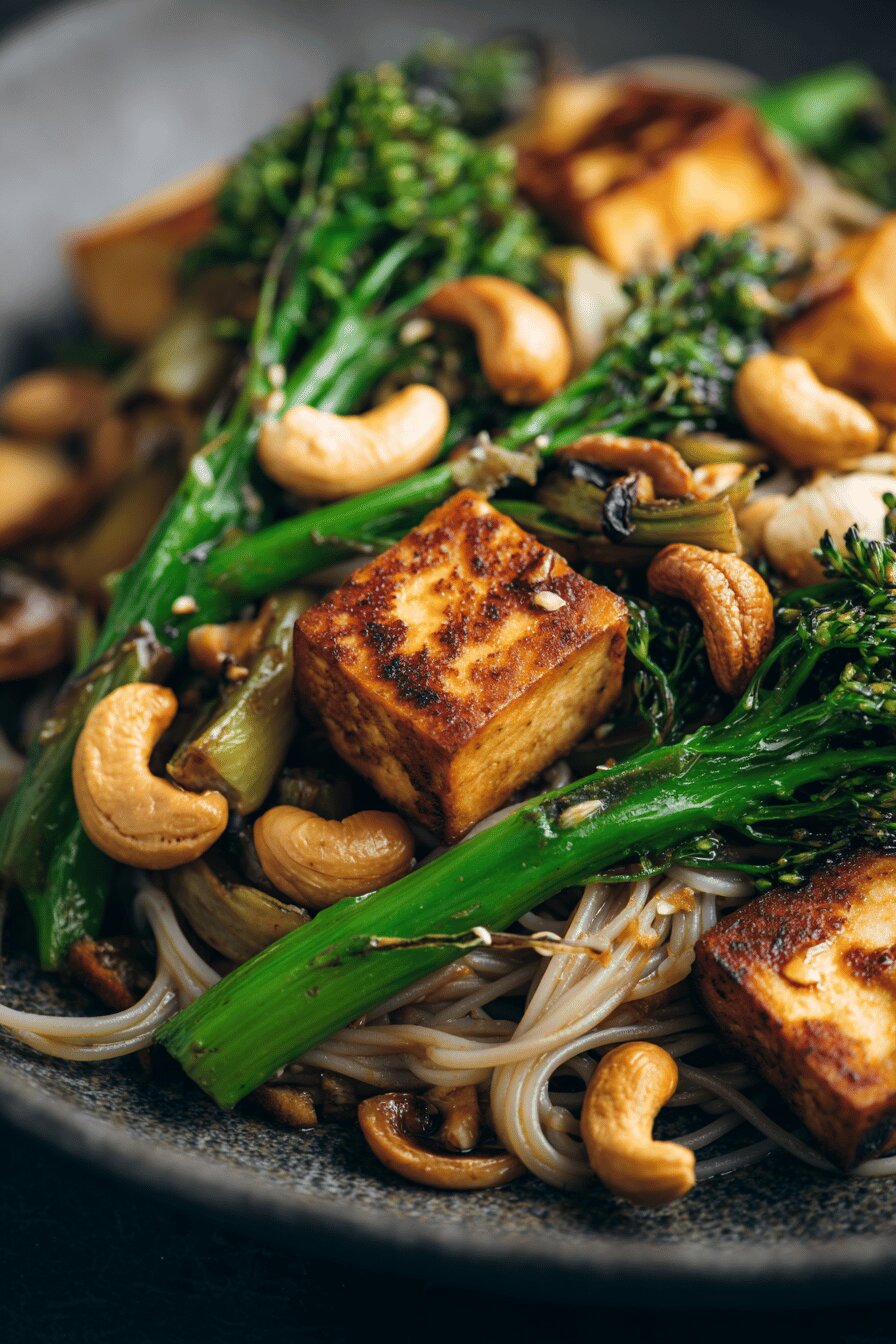 Salteado rápido de tofu firme com legumes crocantes, molho à base de caldo, shoyu, molho de ostra e amido de milho. Combina brócolis, cenoura em fatias, cogumelos shiitake e castanhas de caju torradas para textura. Tofu dourado em óleo de milho, depois tudo refogado com óleo de gergelim tostado. Prato sem glúten, sem lactose e vegano-friendly, excelente para refeições leves e nutritivas. Serve bem com arroz integral ou macarrão de arroz. Tempo total em torno de 50 minutos, rende quatro porções satisfatórias.