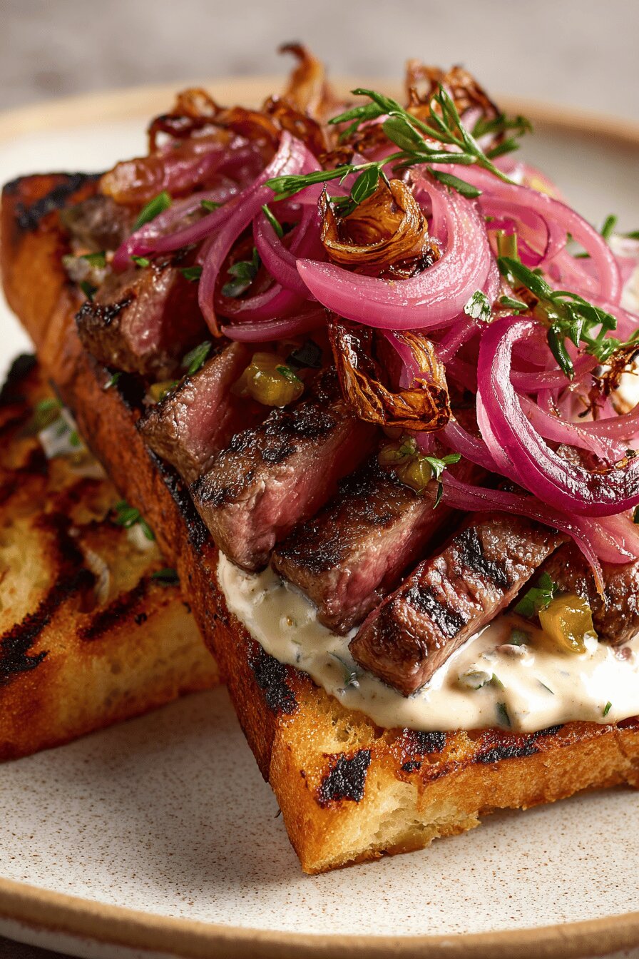 - Fatio a carne bem fininha contra a fibra para garantir maciez na mordida. Espalho o molho cremoso feito com creme azedo, estragão, mostardas e picles diretamente na parte crocante do pão, só 1 camada generosa - o molho dá frescor e tempero intensos. Por cima, distribuo as cebolas caramelizadas, uma camada que vai trazer doçura e umidade sutil. Depois, meto as fatias de carne e finalizo com o funcho marinado escorrido, só para juntar acidez e crocância.