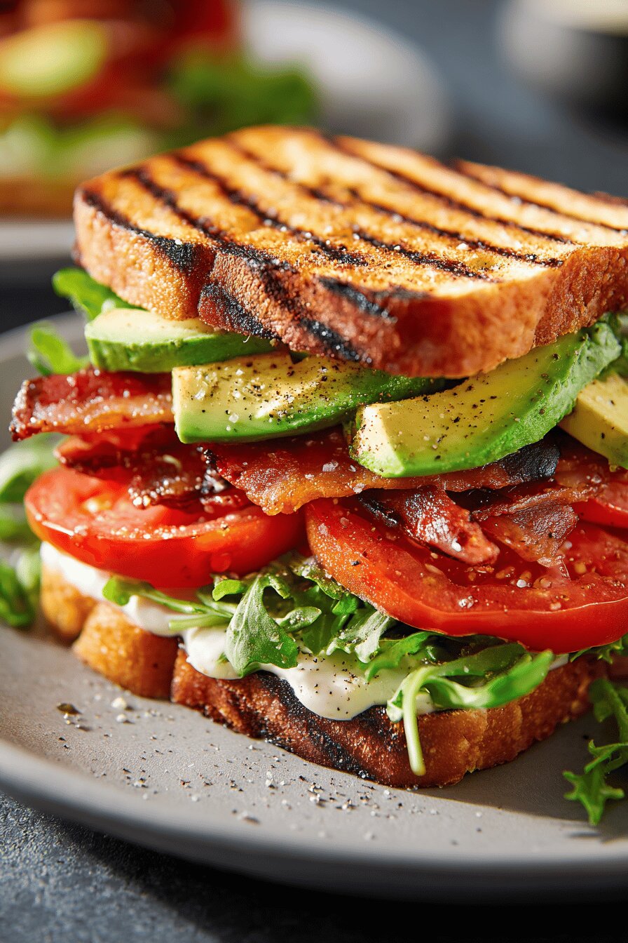 Sanduíche com uma pegada crocante e fresca, usando bacon levemente temperado, alface e tomate suculento, com pão tostado e maionese caseira de manjericão. Troquei o bacon tradicional pelo bacon defumado com páprica para trazer um aroma diferente e o alface americana pela rúcula para um toque amarguinho. O preparo prioriza o ponto visual do bacon e o equilíbrio entre crocância e frescor, além de evitar que o pão amoleça com a umidade do tomate, aplicando a maionese com ervas finas. O segredo é assar o bacon em forno alta temperatura até o som de crepitar diminuir, sinal que está no ponto certo. Sal e pimenta na hora certa para não mascarar.