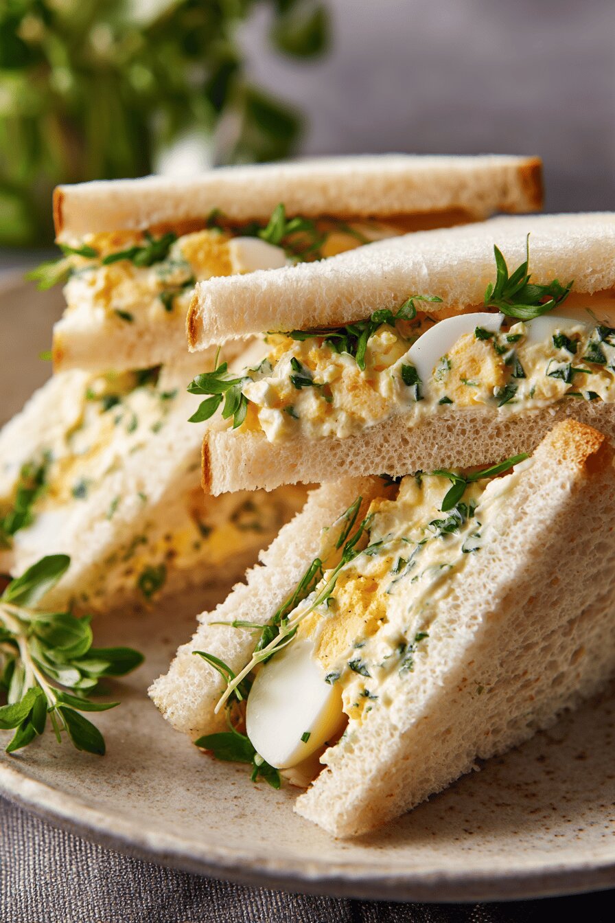 Pão branco macio, ovos cozidos picados com maionese, queijo parmesão e cebolinha. Uma pitada de sal e pimenta. Finalizado com maionese extra e mistura fresca de ervas (endro, cebolinha, estragão). Cortado em 24 triângulos que funcionam como belisquete. Sem lactose, sem nozes, vegetariano. Rápido, fácil, ideal para lanche ou piquenique. Textura cremosa, sabor leve, toque herbal.