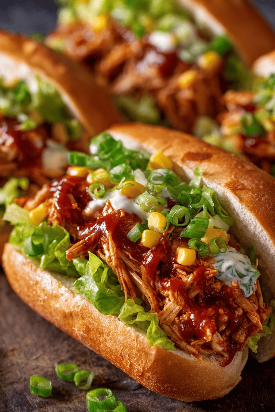 Pedaços de frango desfiado com milho doce, misturado numa maionese picante e molho barbecue caseiro. Servido em pão tipo submarino com alface crocante. A combinação tem toques de especiarias, um molho agridoce com geléia de maçã, e um toque fumado de Worcestershire com Tabasco. Receita rápida, vai direto ao ponto, perfeita pra refeições descomplicadas e com um sabor marcante.