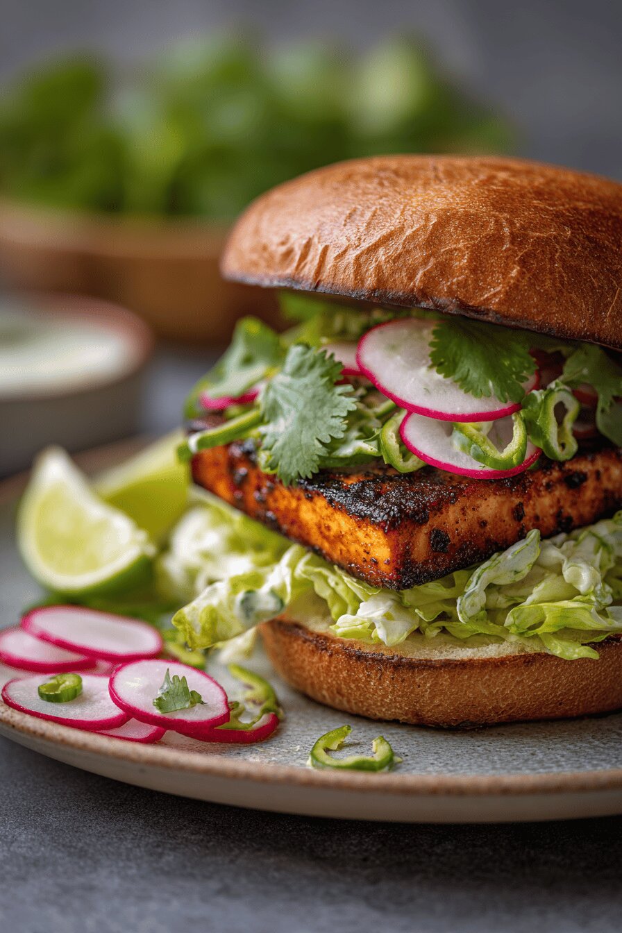 Sanduíches com tofu firme marinado em pimenta chipotle, limão, mel e azeite. Vegetariano, sem lactose e sem nozes. Acompanhado de uma salada crocante com alface iceberg, rabanetes, cebolinha, coentro e maionese temperada. O tofu é grelhado até formar textura firme, e os pães são tostados para um contraste agradável. Ideal para quem quer algo leve, cheio de sabor e com um toque levemente picante. Fácil de preparar, especialmente em churrascos, com variações simples para vegetarianos e veganos. Uma opção diferente para o dia a dia, com ingredientes frescos e montagem prática.