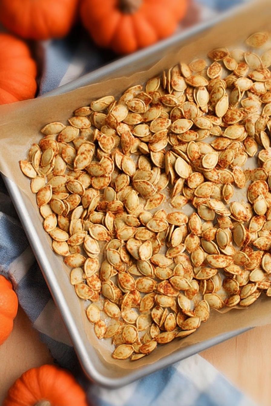 Sementes de abóbora torradas no forno, crocantes, levemente amanteigadas e com tempero levemente picante que aquece o paladar. Uma forma simples e econômica de reaproveitar as sementes após preparar abóbora. A receita traz saturação ideal de sabores sem exageros. Pode usar manteiga ou azeite, mistura de pimentas e especiarias variáveis para ajuste ao gosto. Resultado dourado, com aroma intenso de especiarias e textura firme crocante. Um snack nutritivo, rico em fibras e proteínas, ótimo para petiscar ou adicionar crocância em saladas e pratos variados.