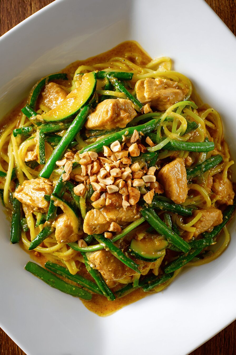 Noodles soba cozidos com tiras de frango, asparagus e pimentão, regados em um molho cremoso de amendoim com leite de coco, gengibre e sabores intensos como citronela e molho hoisin. Saltei o frango rapidamente para manter suculência, depois misturei tudo para um prato vibrante, texturizado com amendoins crocantes e refrescante raspas de pepino. Troquei a citronela por capim-cidreira, um toque mais suave, e o leite de coco tradicional por leite vegetal de aveia para uma textura diferente. Cozinhar na medida certa evita noodles empapados, e atenção às temperaturas do wok faz toda diferença no sabor final.