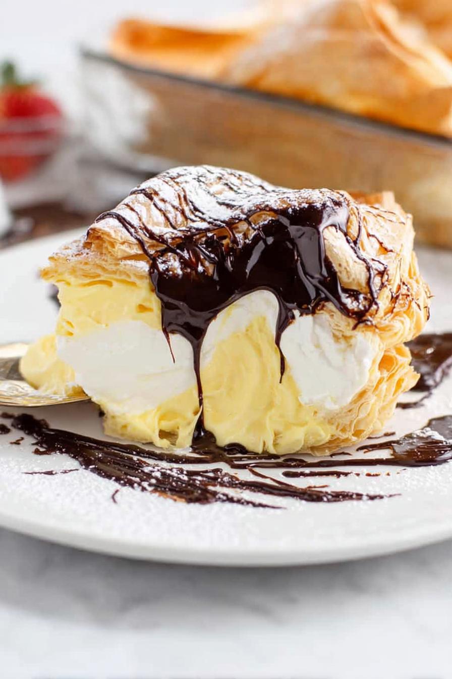 Uma sobremesa com massa leve tipo suspiro assada em refratário, recheada com creme a base de cream cheese e pudim instantâneo, coberta com chantilly e finalizada com calda quente de chocolate. O preparo usa técnicas básicas de cozimento de massa choux, equilíbrio de texturas e mistura de ingredientes que realçam aroma e sabor. Ideal para servir em festas com fácil porcionamento e visual atraente. Ajustes nos tempos e ingredientes evitam apiçamento e garantem cremosidade sem perder leveza, enquanto o uso do requeijão cremoso no lugar do cream cheese traz uma leve acidez familiar.