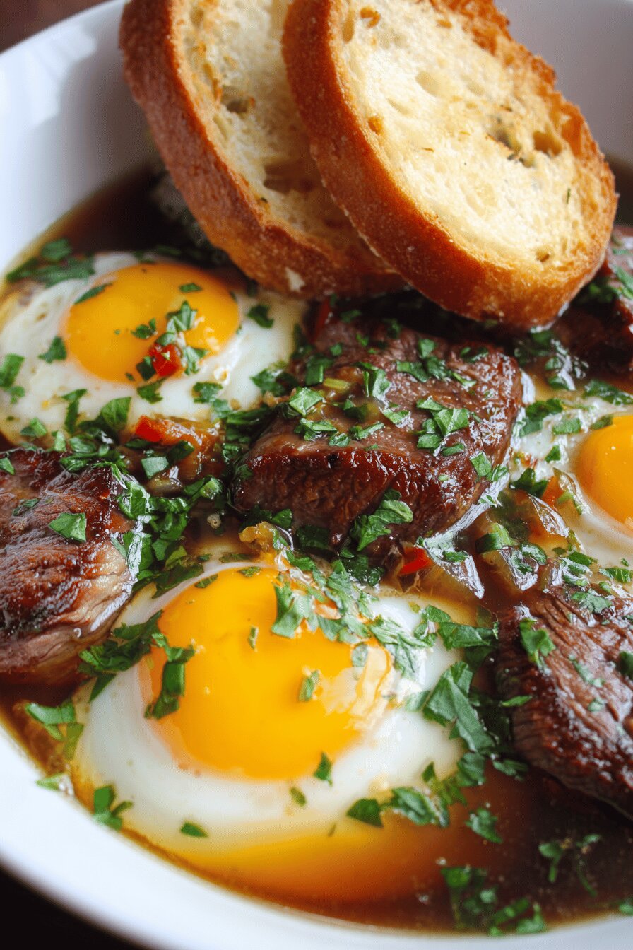 Sopa densa com cebolas caramelizadas na manteiga e cerveja clara. Caldo robusto de carne cozido até reduzir. Bifes de alcatra grelhados no molho, finalizados com ovos cozidos lentamente na mesma frigideira. Fatias crocantes de pão francês completam o prato, junto com salsinha fresca picada. Uma receita reconfortante, com pitadas francesas e toque brasileiro na execução e apresentação.