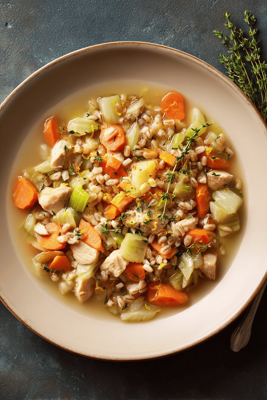 Combinação robusta de frango desfiado e cevada perolada, perfumada com erva-doce e um toque de gengibre. Vegetais refogados na manteiga trazem textura e cor. Cozida lentamente até cevada ficar macia, soltando aroma intenso, essa sopa entrega conforto na colherada. Versão adaptada com nabo no lugar do aipo, e metade da manteiga substituída por azeite para mais leveza. Ótima pra dias frios, especialmente quando o cheiro invoca memória de casa da avó. Pode usar peito ou sobrecoxa, com as dicas de retirar rápido para não ressecar. Cozinha prático, ingredientes fáceis — ideal pra quem curte caldo encorpado, simples e sem frescura.