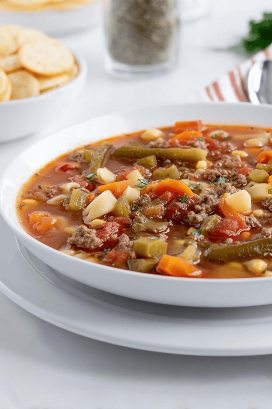 Um cozido robusto de carne moída com legumes variados e macarrão, ideal para quem precisa de uma refeição completa, rápida e reconfortante. Troquei o milho enlatado por milho fresco para dar um sabor mais natural e aproveitei para usar caldo de legumes caseiro, reduzindo o sódio e intensificando o aroma. O segredo? Paciência na hora de dourar a carne, escorrer a gordura para não ficar pesada, e mexer o macarrão para não empelotar. Tudo rende bastante, boa para família grande ou sobras pra semana toda.