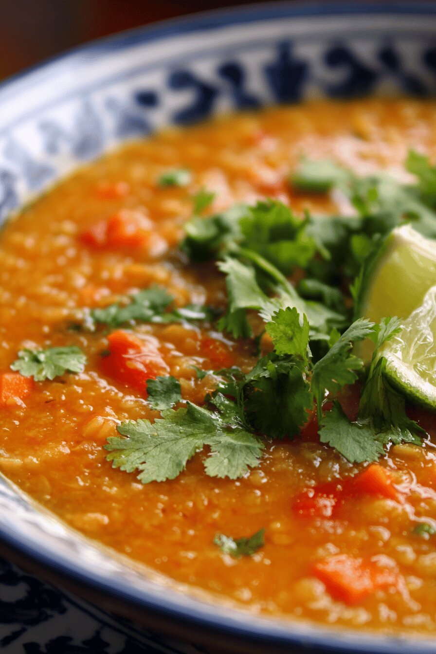 Sopa feita com lentilhas vermelhas cozidas em caldo de legumes, com toque de curry, gengibre fresco e leite de coco. Levemente picante, cremosa e reconfortante. Ideal para dias frios e quem busca receitas sem glúten, lactose ou ovos. Tem pasta de tomate para dar acidez e profundidade, combinada com um leve toque amanteigado de azeite de coco, substituindo manteiga tradicional e trazendo sabor tropical brasileiro.