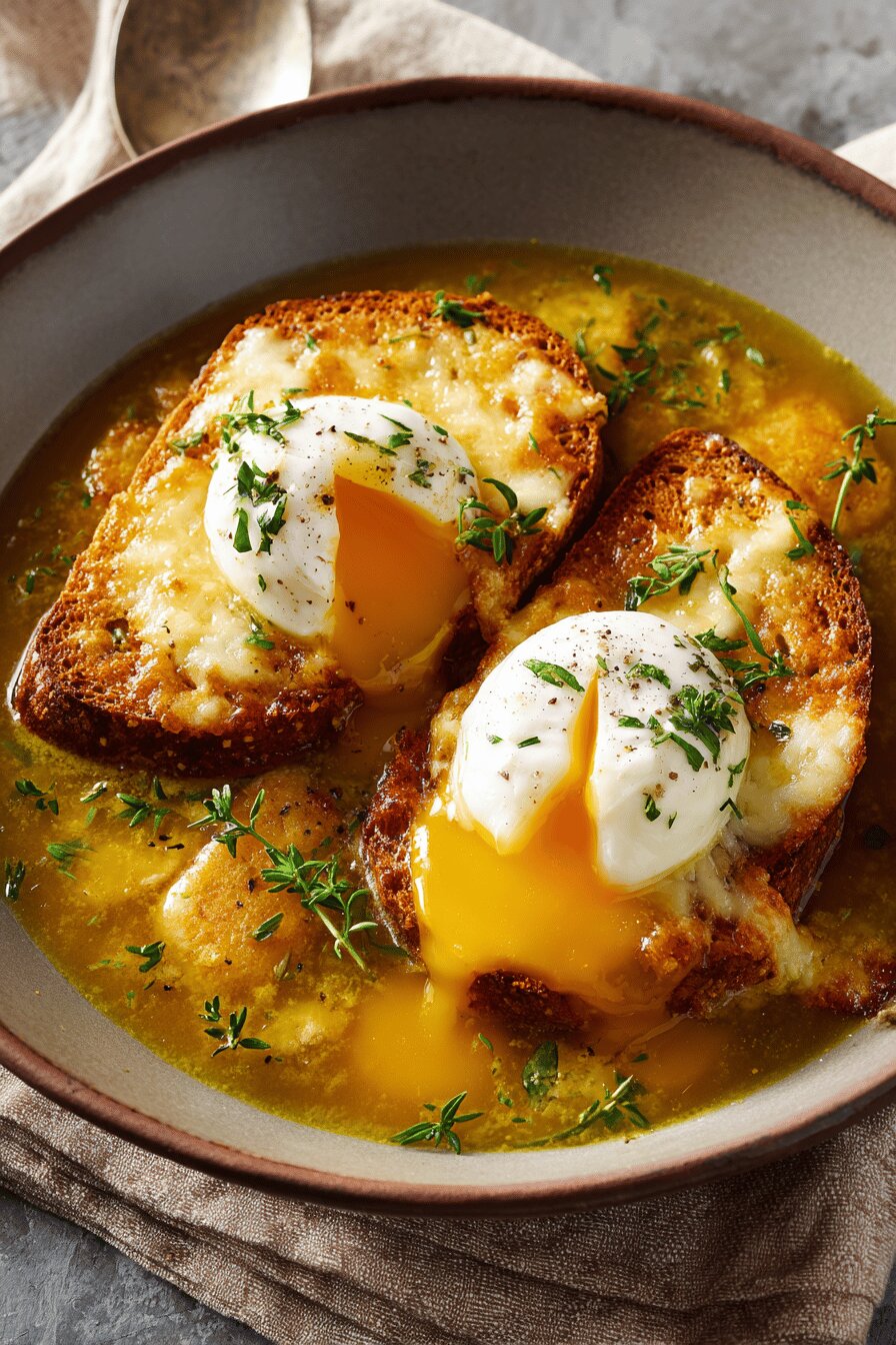 Esquentar a manteiga devagar e dourar o alho é o passo onde todo sabor nasce; não acelere, senão queima e fica amargo. O cozimento com tomilho precisa ser suave, quase sopa perfumada, não ferver com força. Retirar os sólidos antes da finalização evita amargor; o alho volta depois esmagado para liberar sabor sutil, e o açafrão para cor e nota delicada. Tostar o pão firme o suficiente para segurar o queijo derretido e o ovo, sem amolecer é importante – funciona também usar frigideira quente com um pouco de manteiga para acelerar sem deixar ressecado. Para ovos pochê, mexer o caldo pra criar redemoinho ajuda a gema se manter central; tirar quando a clara estiver totalmente opaca, mas textura ainda macia. Servir rápido pois o prato se desintegra lentamente com o calor da sopa. Uma colher com boca larga ajuda a pegar tu-d-o: sopa, ovo e pão.