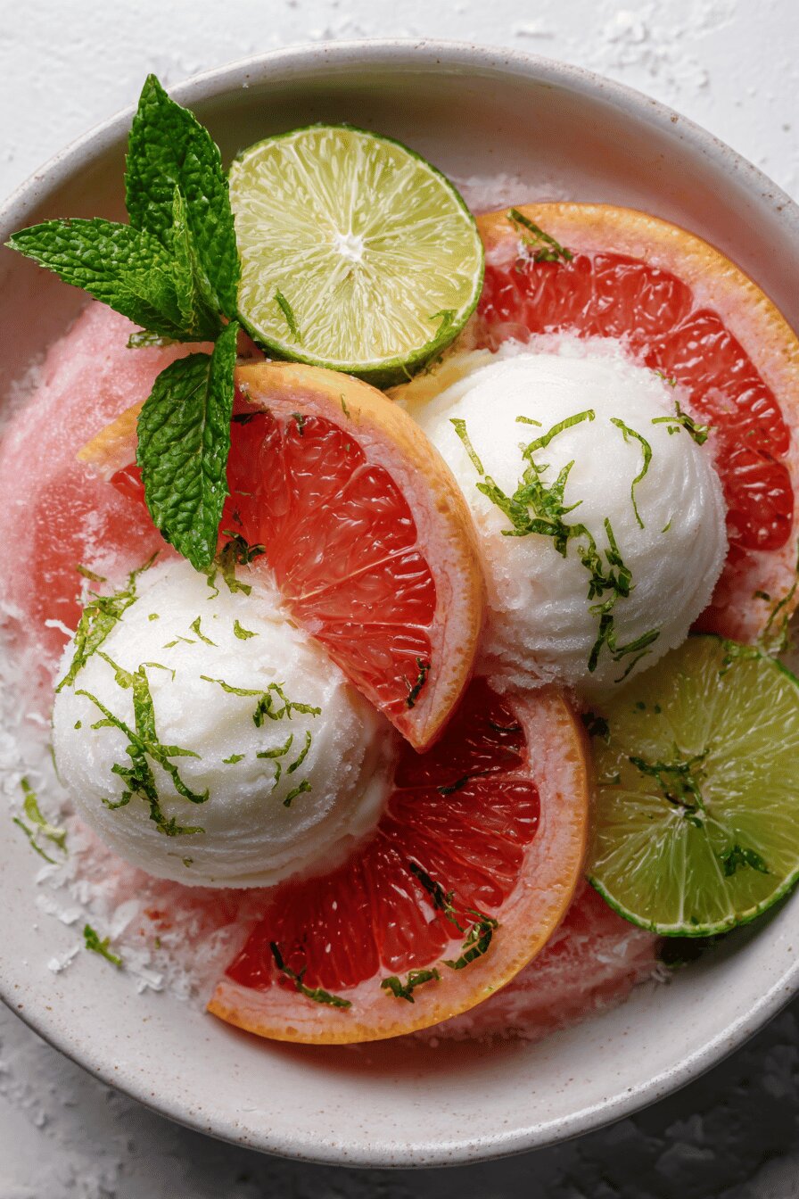 Sorbet refrescante à base de suco de limão siciliano, água e açúcar, com toque aromático de hortelã fresca. Vegano, sem glúten e laticínios, ótimo para dias quentes. A textura cremosa e firme é resultado do equilíbrio entre os ingredientes e o tempo certinho do congelamento. Substitui o limão tradicional por siciliano para um sabor menos ácido e mais perfumado, e adiciona folha de hortelã para frescor inesperado. Receita adaptada com redução do açúcar, para não ficar enjoativo.