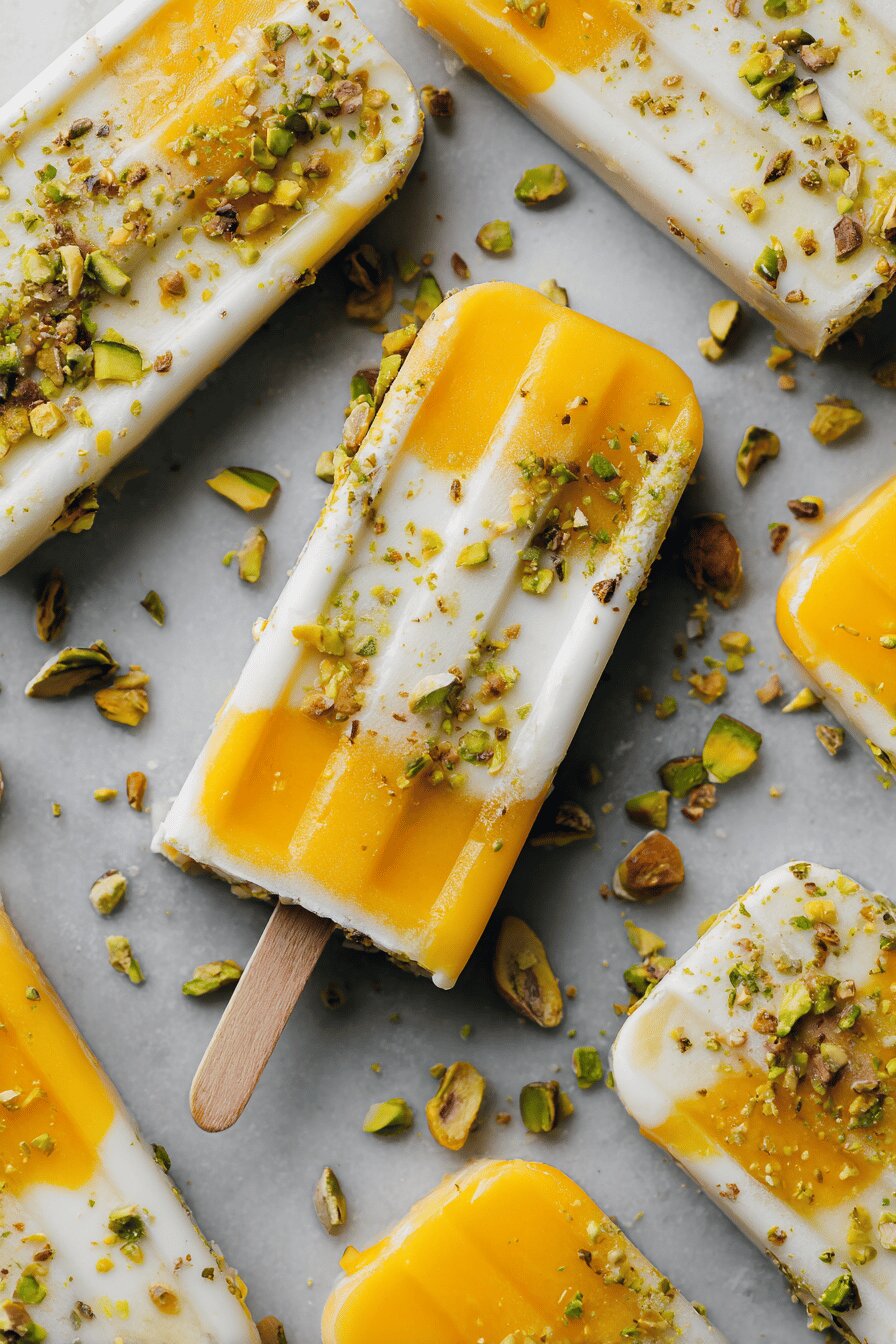 Uma versão gelada do clássico indiano lassi de manga, com iogurte grego e toque crocante das pistaches. Pouco açúcar, textura cremosa e frescor na medida certa. Uso manga fresca ou congelada, dá pra substituir pistache por amêndoas ou castanha de caju. Congela até criar casquinha firme, mas não deixar cristalina. Mistura simples, só cuidado pra não dissolver o açúcar demais e perder o frescor do iogurte. Sempre uma surpresa a textura final, que une doce, ácido e salgado no palito. Ideal pra dias de calor ou pra surpreender qualquer fã de sobremesas geladas sem complicação.