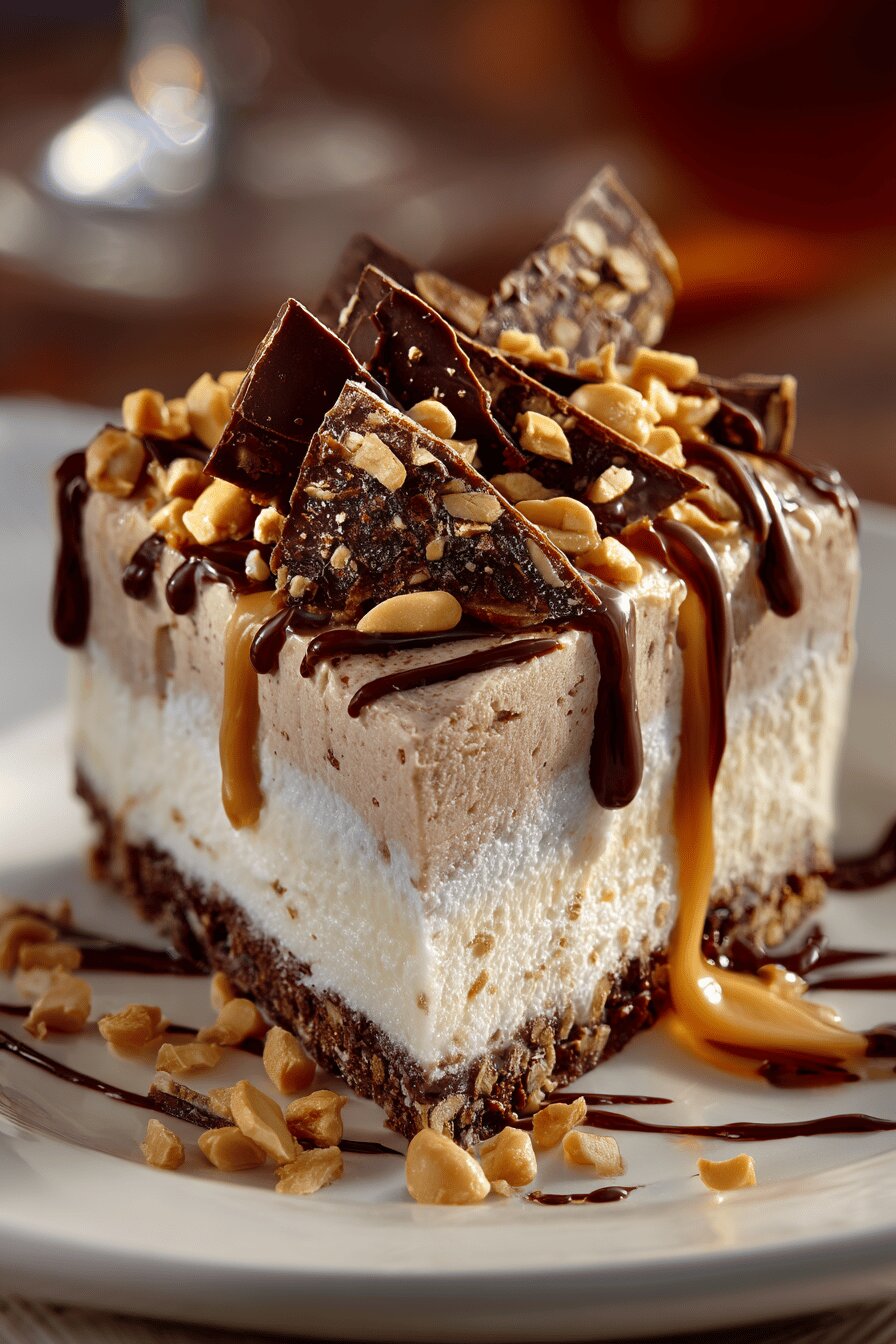 Gelado feito sem sorveteira, mistura duas cremes: baunilha e chocolate, intercalados com pedaços crocantes de chocolate coberto com creme de amendoim. Finalizado com uma calda quente de fudge e amendoim, opcional chantilly e cerejas. Texturas contrastantes, sabores intensos, método sem máquina para facilitar. Uso creme de leite fresco batido e leite condensado pra cremosidade. Substituições para alergias e toque brasileiríssimo dão cara nova.