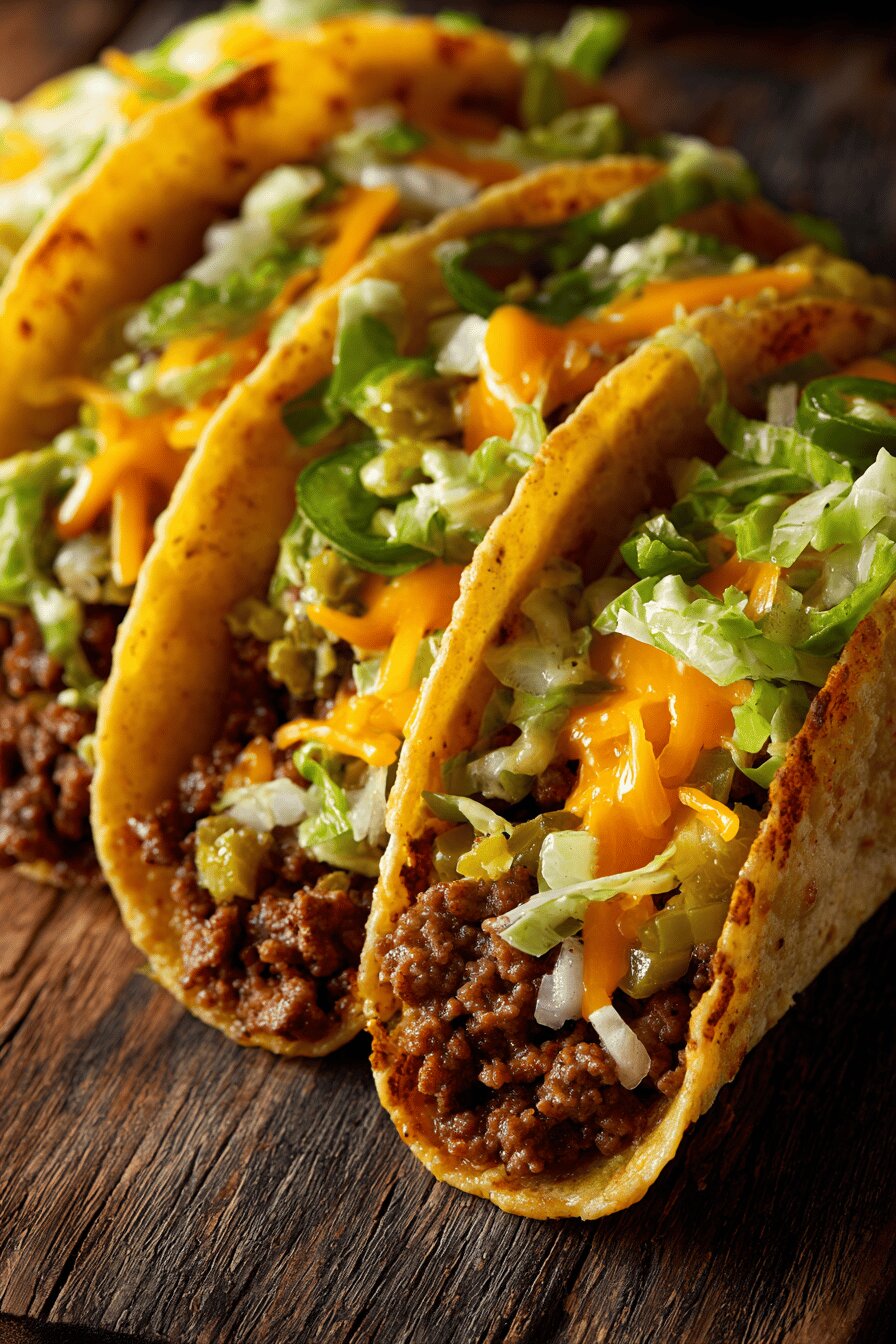 Carne moída com tempero suave, tostada em tortilhas de trigo, coberta com queijo derretido e molho cremoso temperado, além de alface crocante e picles finamente picado. Pronto em cerca de 40 minutos, serve quatro pessoas. Receita com ingredientes ajustados para um toque diferente, usando maionese temperada e um molho com relish e vinagre. Cozimento equilibrado para carne suculenta e queijo cremoso. Ótimo para jantar prático sem nozes nem ingredientes difíceis. Toda a mistura e toques finais na panela ajudam a concentrar sabores.