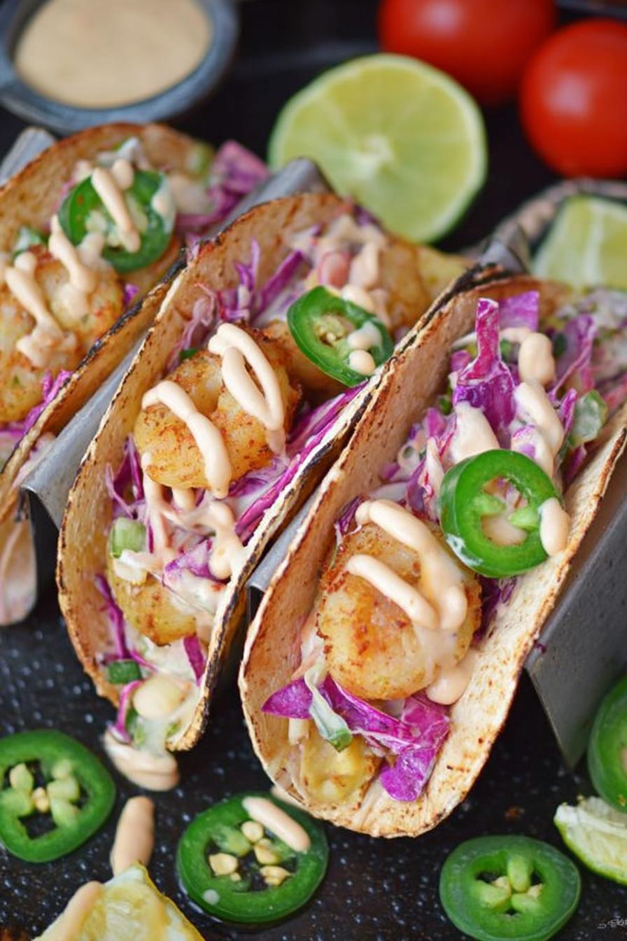 A técnica mais importante é marinar e não exagerar no tempo; camarão marinado demais pode ficar ‘cozido’ no ácido e perder textura. Massageie com cuidado para o tempero entrar sem amassar a carne. O fogo no cozimento tem que ser médio; muito alto queima o camarão por fora deixando cru dentro, muito baixo faz soltar muita água e cozinhar no próprio suco, tornando-o mole. O formato de C aberto é o sinal ideal — se fica fechado demais fica ressecado. Para o slaw, misture bem para o limão e açúcar distribuírem, mas deixe descansar para os sabores se assentarem. Na montagem, não encha demais as tortilhas para não dificultar ao comer. O creme frio ao fim dá equilíbrio e refrescância, diferente só de molho de pimenta direto que pode pesar.